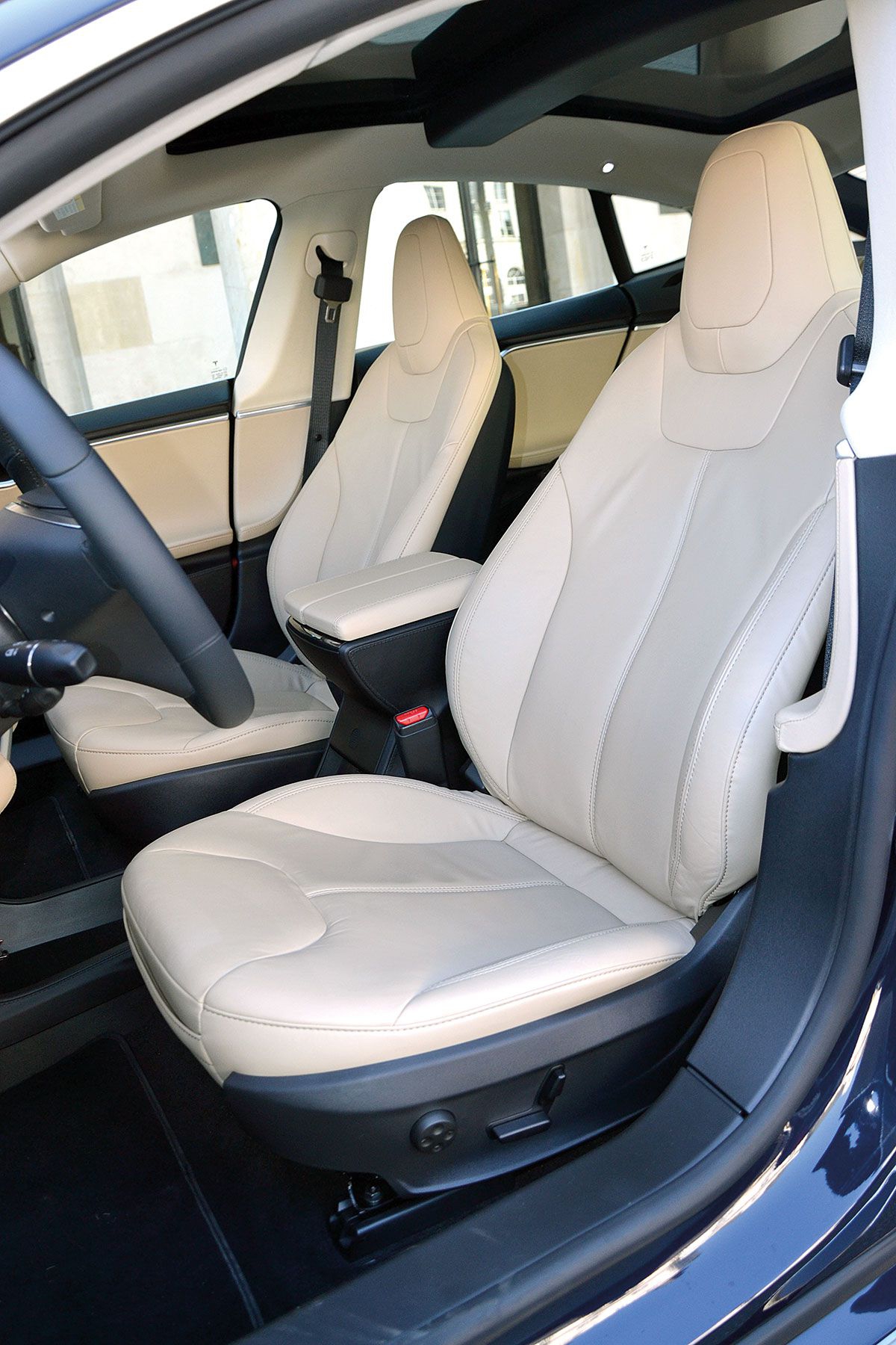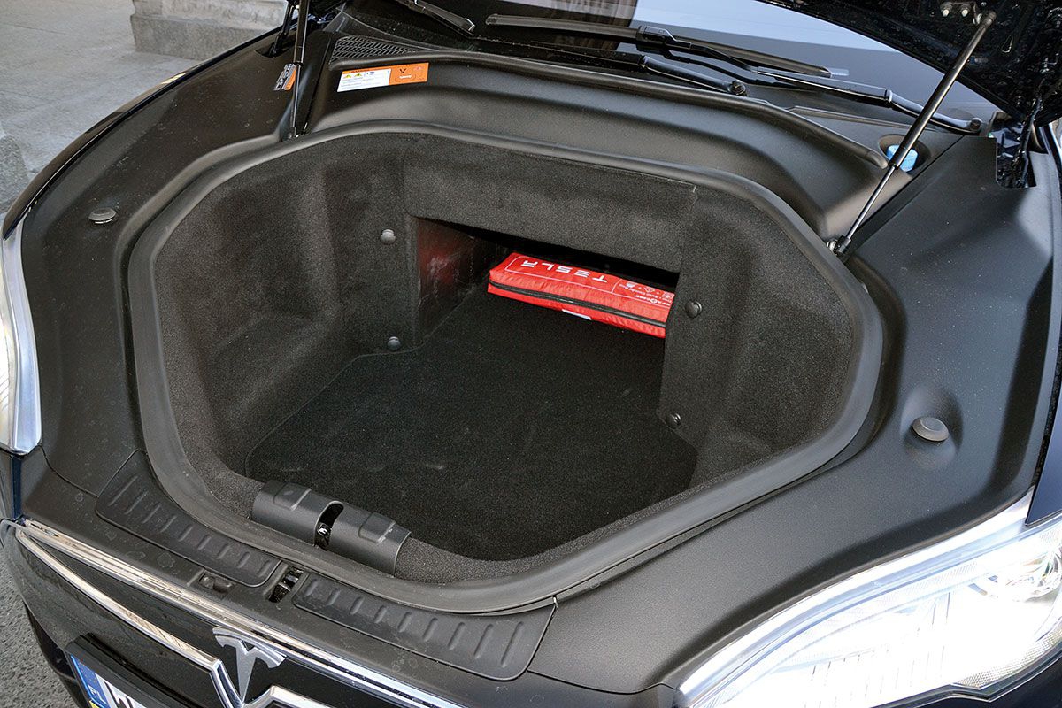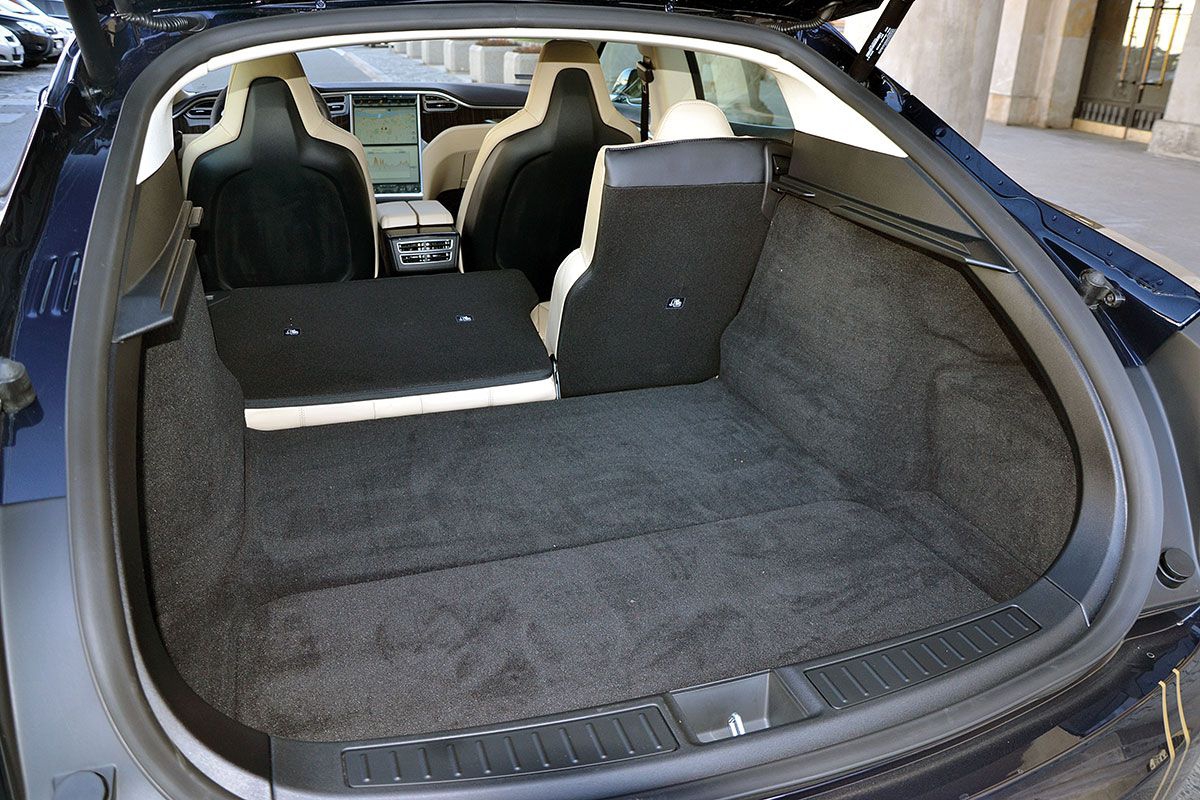 Producent zastosował w pojeździe cienkościenne fotele i tylną kanapę ze zintegrowanymi zagłówkami, co pozwoliło oddać pasażerom dodatkowe centymetry w kabinie. Wnętrze samochodu nie zachwyca liczbą schowków: rynna między fotelami, podłokietnik czy schowek przed pasażerem to trochę za mało. Brakuje ich np. w drzwiach. Za to Tesla błyszczy w zakresie możliwości przewozowych. Tylna klapa podnosi się wraz z szybą, czyli samochód ten jest klasycznym liftbackiem. Dysponujemy w nim bagażnikiem o pojemności 745 litrów, który możemy łatwo powiększyć do 1645 litrów składając na płasko oparcie tylnej kanapy. Producent oferuje również trzeci rząd siedzeń montowany w bagażniku tyłem do kierunku jazdy, przeznaczony dla dzieci. Pod przednią klapą nie znajdziemy jednak elektrycznego silnika tylko kolejny bagażnik o pojemności 150 litrów, niczym w poczciwej Tatrze 603. Silnik Tesli zamontowano przy tylnej osi, którą też on napędza.