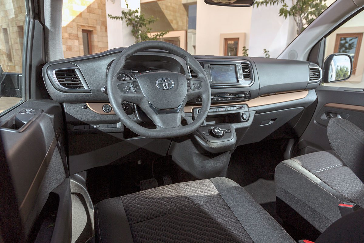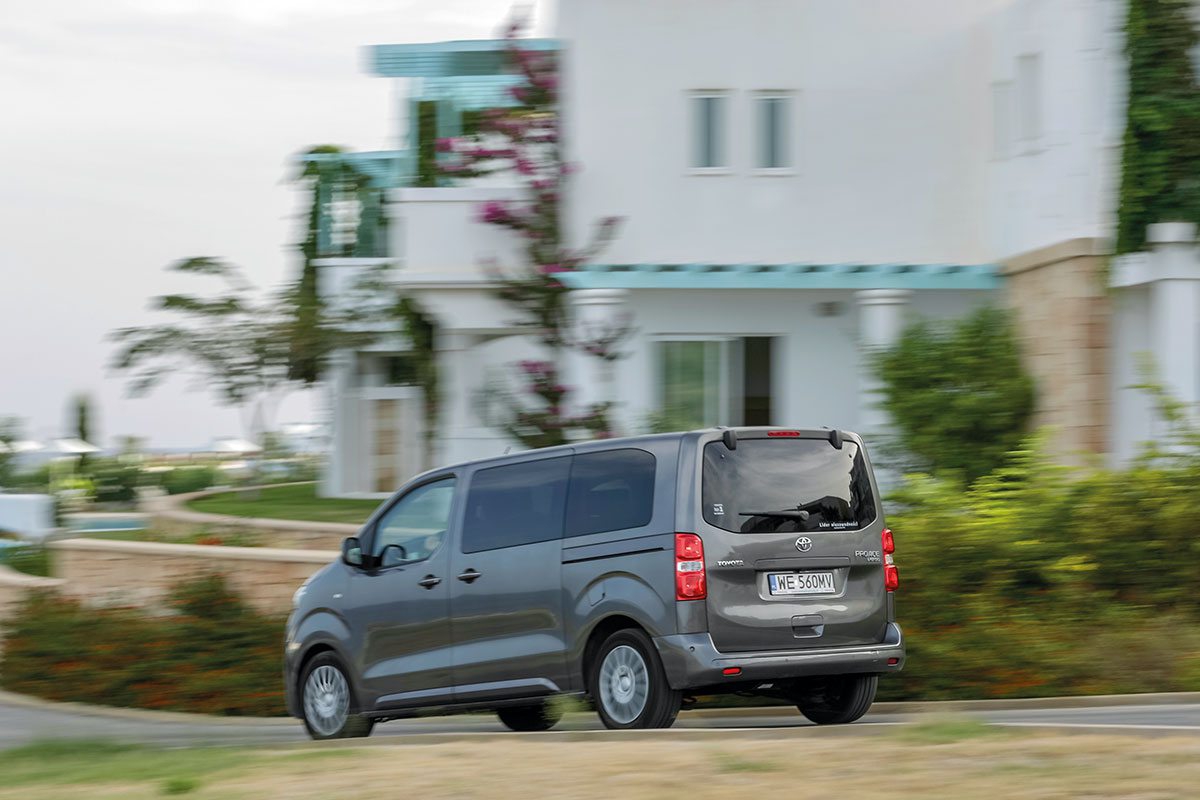 Podczas testu miałem okazję prowadzić i być wożonym samochodem z automatyczną skrzynią biegów, a więc wersją 180-konną w wyposażeniu family. Mogę powiedzieć, że podlegająca pod dostawczy dział Toyota jest wewnątrz wykonana nie gorzej, a może i lepiej, niż jej niektóre modele osobowe. Porządne materiały, co prawda jak producent nas przyzwyczaił w różnych odcieniach czerni, są mądrze dobrane. Tam, gdzie trzeba miękkie, tam, gdzie mogą szybciej ulegać zabrudzeniu, wykonane z tworzyw łatwych do utrzymania w czystości. Pozycja za kierownicą jest porównywalna ze wzorem w klasie, jakim jest dla mnie Volkswagen T6. Czytelne zegary, sterowanie w kierownicy pozwalają skupić się na drodze. W części centralnej nawigacja. Wszystko, czego potrzeba. Podobno w kabinie słychać było hałas wynikający z pracy turbosprężarki. Podobno, ja nie słyszałem. Nie miałem okazji prowadzić samochodu z kompletem pasażerów, ale jako jeden z nich podróżowałem, kiedy był komplet. Na tej podstawie mogę powiedzieć, że 180 KM i 400 Nm to w sam raz.