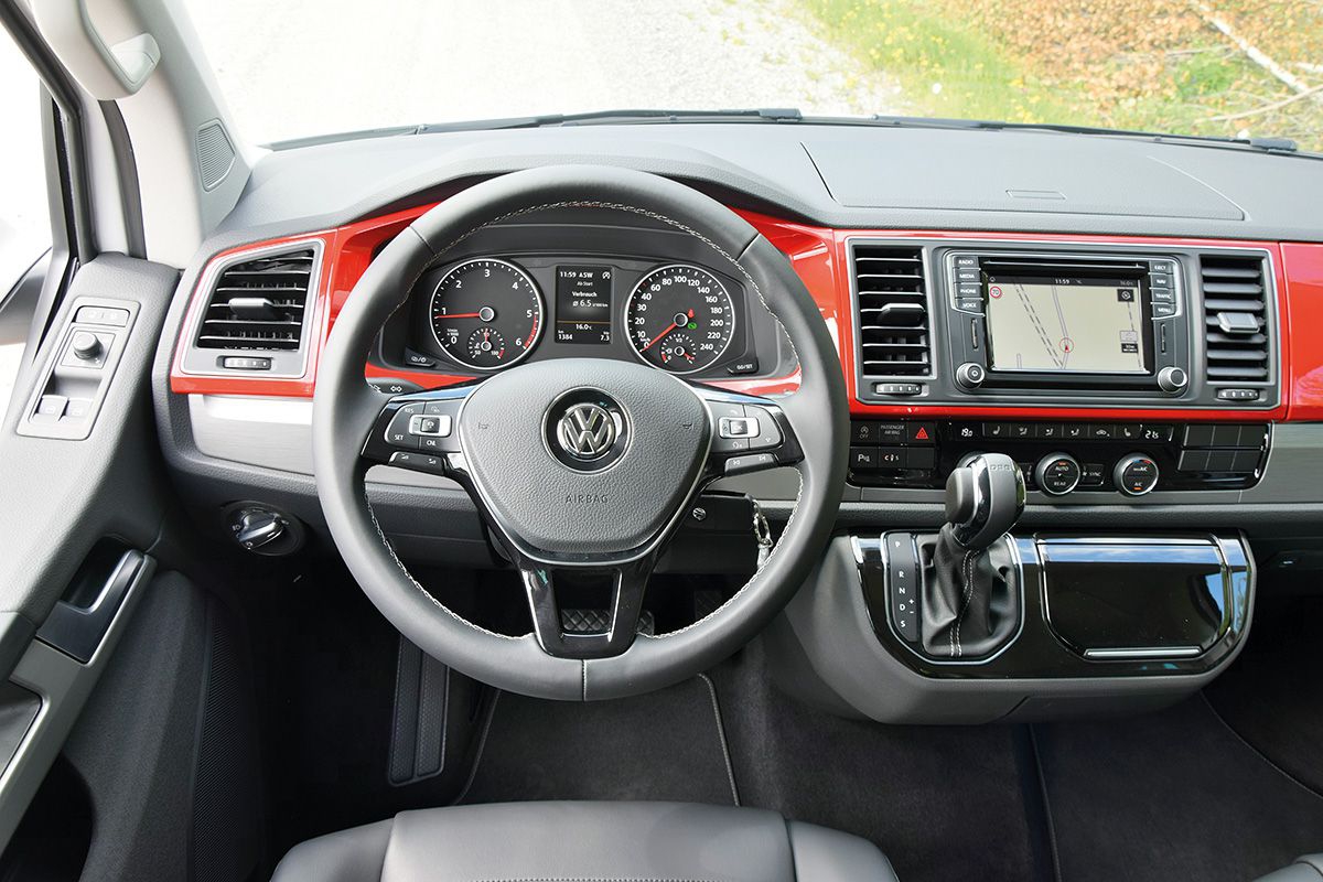 Do wyboru w nowym Transporterze są w sumie cztery systemy radiowe lub radiowo-nawigacyjne. Wszystkie urządzenia wyposażono w system Bluetooth. Ekran o przekątnej 6,33 cala reaguje na zbliżenie ręki – z monitora znikają wtedy wskaźniki, a pojawia możliwość wybrania funkcji przez kierowcę. Dla podniesienia komfortu można zamówić elektrycznie regulowane fotele, które są seryjnie wyposażane w funkcję podgrzewania. W opcji jest też dostępna ogrzewana przednia szyba. Wnętrze co prawda obfituje w sporą liczbę schowków, ale niestety nie pomyślano o miejscu, w którym moglibyśmy wygodnie umieścić dokumenty w formacie A4 czy laptopa podobnych rozmiarów.