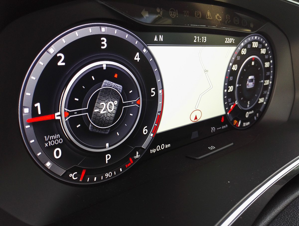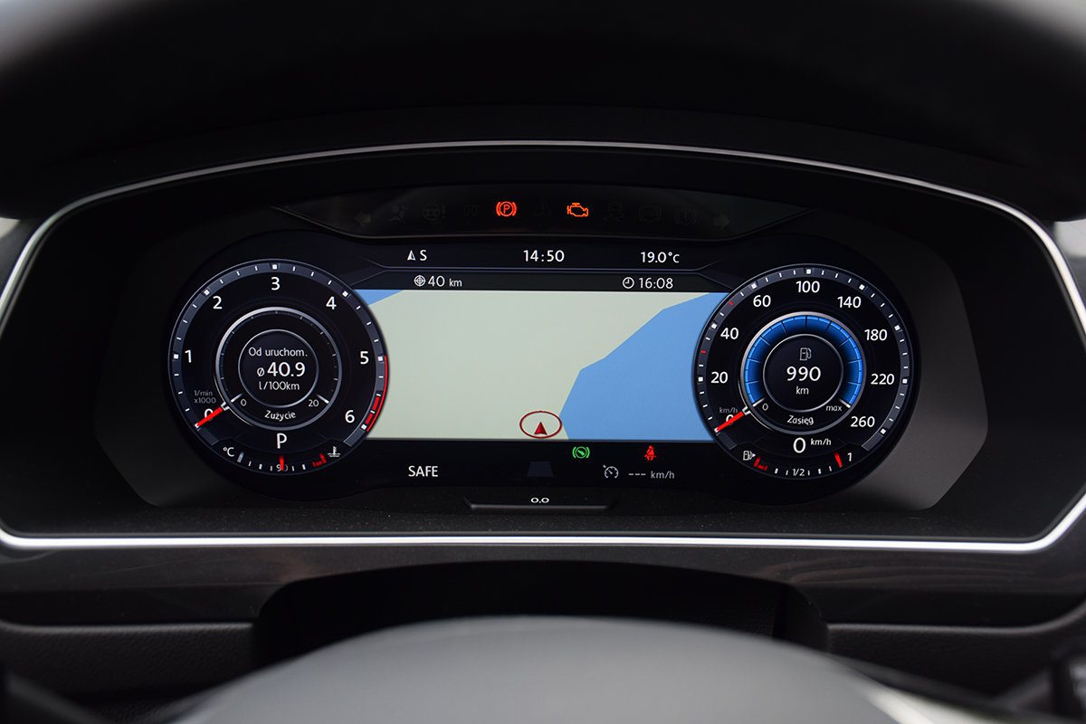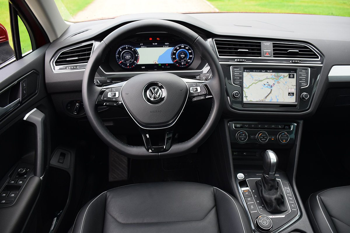 Wnętrze Tiguana, podobnie jak niemal każdy współczesnego Volkswagena, stanowi wzór uporządkowania i ergonomii. Na plus możemy zaliczyć jakość materiałów. W topowych wersjach w miejscu zestawu zegarów zastosowano ekran o przekątnej 12,3 cala. Na nim, oprócz danych o prędkości, obrotach silnika i informacjach o stanie pojazdu, możemy m.in. śledzić wskazówki nawigacji. Po wyborze trybu offroadowego wyświetli się nam wskaźnik kąta skrętu kierowniczy oraz kompas. Oczywiście, w Tiguanie możemy podłączyć smartfon lub tablet do samochodowych multimediów i korzystać z ich wybranych funkcji poprzez wyświetlacz na środkowej konsoli.