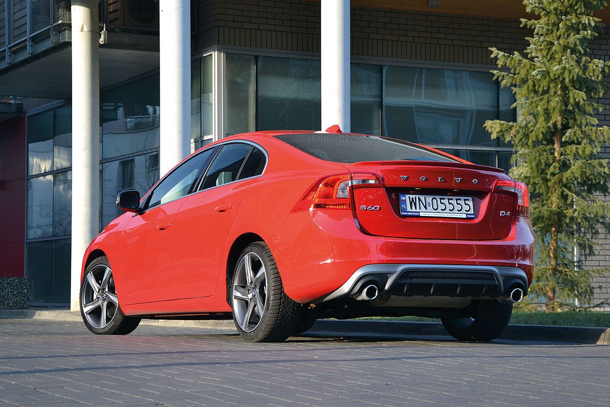 Trzeba przyznać, że testowane Volvo S60 z pakietem R-Design (+7100 zł) i czerwonym lakierze, choć bardzo efektowne, nie będzie zbyt częstym widokiem na drogach. Lakier ten, co ciekawe, nie wymaga dopłaty. Samochód w tej wersji wyróżnia się m.in. 18-calowymi alufelgami z niskoprofilowymi oponami, dwiema końcówkami wydechu, dodatkowym spoilerem na klapie bagażnika, srebrzystymi obudowami lusterek czy nową kratką wlotu powietrza. W ramach pakietu auto jest doposażone również w sportowe zawieszenie, aluminiowe pedały, płytę ślizgową pod podwoziem oraz specjalne obszycie skórą kierownicy i dźwigni zmiany biegów. Wnętrze zdecydowanie kontrastuje z dynamicznym i powabnym nadwoziem – jest tu chłodno, przewidywalnie i ergonomicznie. Szarość wysokiej jakości tworzyw nie robi złego wrażenia dzięki licznym aluminiowym elementom, jak panelu środkowej konsoli czy nakładki na kierownicy. Wraz z liftingiem pojawił się nowy elektroniczny zestaw zegarów, który prezentuje się bardzo efektownie, a jest przy tym czytelny. Sedan Volvo ma z pewnością jedne z wygodniejszych foteli w klasie średniej, które swoim wyprofilowaniem i trzymaniem bocznym zadowolą nawet wybrednych entuzjastów aut sportowych. Ilość miejsca można uznać za przeciętną, ale jak na segment D rozczarowuje bagażnik – 380 litrów to o co najmniej 100 l mniej niż rywale.