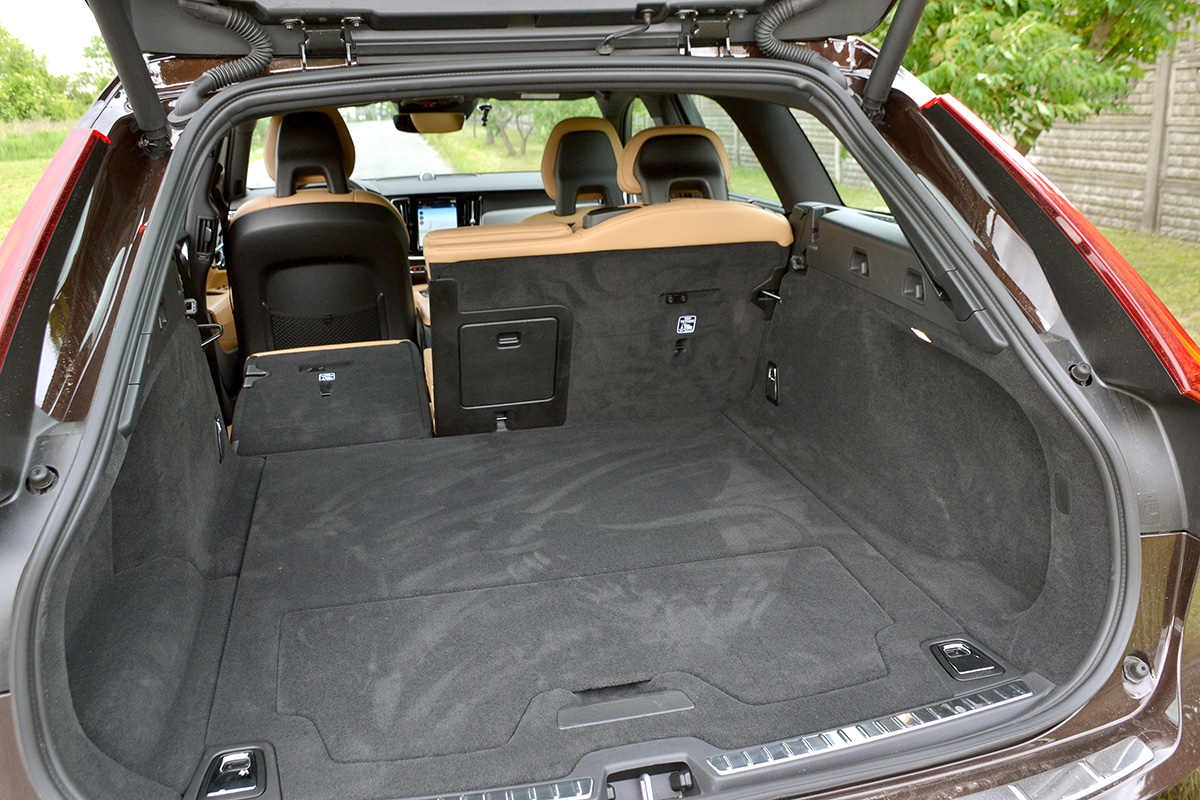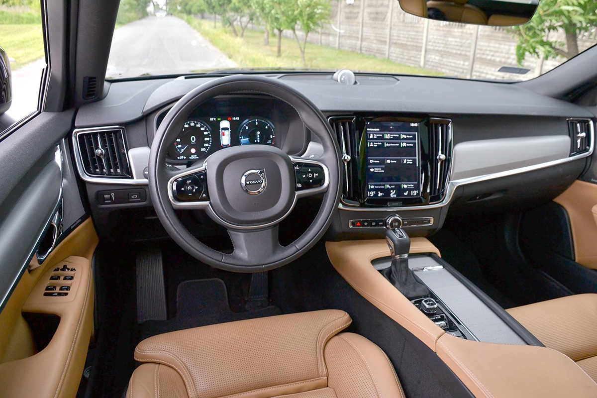 Równie stylowe co nadwozie jest też wnętrze modelu V90 Cross Country. Szczególnie przytulnie prezentuje się kabina wykończona prawdziwym drewnem, jasną skórą i elementami aluminiowymi. Pod tym względem nowe Volvo prezentuje wyższy poziom niż wielu rywali marek niemieckich. Większość funkcji obsługujemy poprzez pionowo osadzony dotykowy tablet o przekątnej 9 cali. To dzięki niemu deska rozdzielcza jest minimalistyczna. Wybór funkcji na dotykowym ekranie wymaga chwili nauki, jednak po jakimś czasie obsługa stanie się dla nas przejrzysta i prosta. Dla osób nieznających najnowszych modeli Volvo ciekawostką będzie sposób włączania silnika. Wystarczy ruch pokrętłem, położonym na konsoli między fotelami. Tuż pod nim zamontowano rolkę zmiany trybów jazdy. Na uwagę zasługują wygodne i dobrze trzymające fotele, które oczywiście w wyższych wersjach oferują rozbudowane funkcje regulacji, masażu, chłodzenia i ogrzewania. Do tego Volvo może się pochwalić bardzo obszernym wnętrzem, również z tyłu. Nie odbiega w tym względzie od wielu aut SUV, choć trzeba przyznać, że model XC90 oferuje więcej, ze względu na znacznie wyższe i szersze nadwozie. Bardzo dobre wrażenie robi opcjonalne nagłośnienie Bowers & Wilkins z 19 głośnikami (+16 tys. zł). W szczególności wyróżnia się w nim brzmienie wzorowane na filharmonii w Göteborgu. Wielkość bagażnika jak na rozmiary pojazdu jest przeciętna. Poprzednicy mieli większe możliwości przewozowe. W zestawieniu z SUV-ami bagażnik jest bardzo przyzwoity, a do tego próg załadunku znajduje się w nim znacznie niżej. Humor pasażerom może się popsuć przy wysiadaniu. Wówczas niezwykle łatwo jest ubrudzić sobie nogawki spodni czy spódnicę o próg pojazdu. Dla wielu nabywców niezwykle istotnym parametrem jest masa przyczepy hamowanej, jaką uciągnie samochód. W modelu Cross Country wynosi ona od 2200 do 2500 kg.