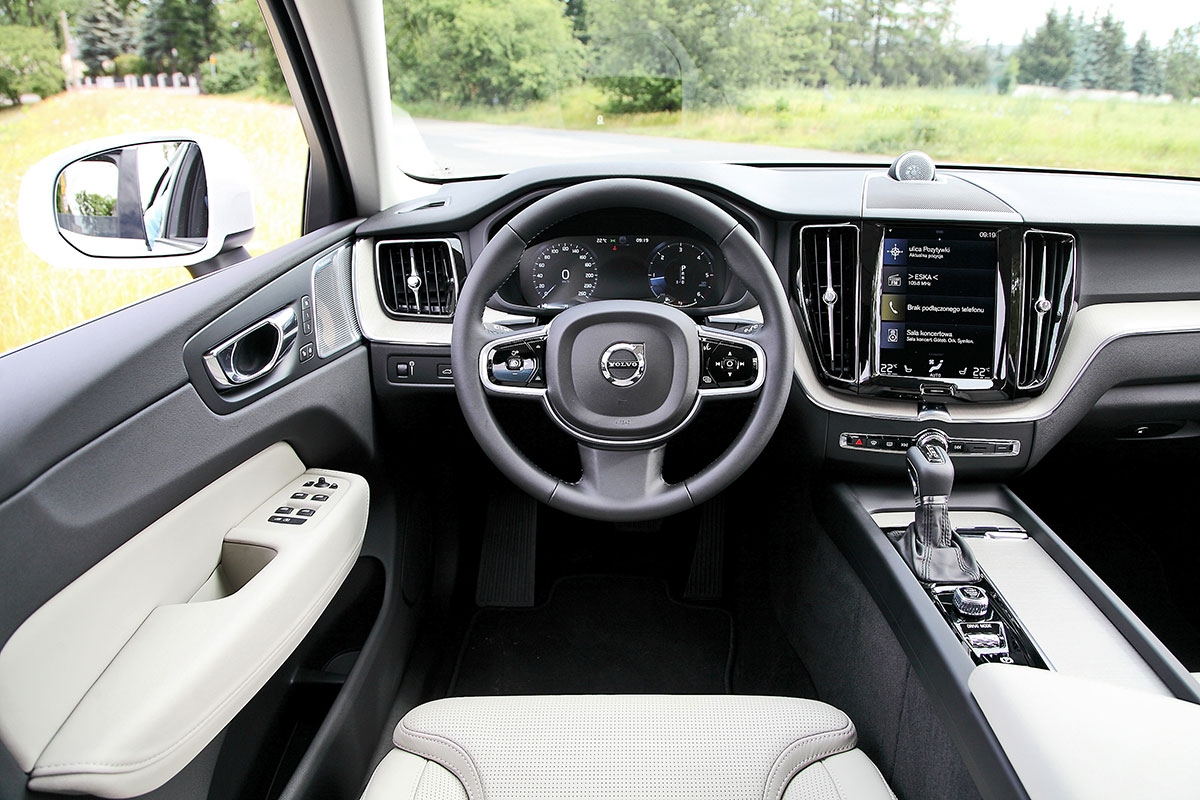 Także wnętrze jednoznacznie przywodzi na myśl topowy model XC90. Kabina nadal ma przyjemne dla oka, surowe i eleganckie kształty. W wersjach z jasnym wnętrzem okazuje się niezwykle przytulna. Deskę rozdzielczą okrojono do MINImum z przycisków i pokręteł. Na środkowej konsoli dominuje ustawiony pionowo wyświetlacz dotykowy systemu multimedialnego. To poprzez niego możemy nie tylko śledzić wskazówki nawigacji, ale też sterować systemem audio, klimatyzacją czy ustawieniami jazdy samochodu. Ekrany możemy zmieniać, przesuwając je jednym ruchem ręki w prawo lub w lewo, podobnie jak w smartfonach. I tak jak w nich ekran ten niestety szybko kurzy się i palcuje. Bardzo wygodne fotele nowego SUV-a również pochodzą z większego XC90, podobnie jak opcjonalny panoramiczny dach (+6390 zł). Biorąc jednak pod uwagę, że XC60 jest 25 cm krótszy od flagowego SUV-a Volvo, dach ten prezentuje się jeszcze bardziej imponująco pod względem rozmiarów. Producent zadbał o wiele detali, np. pióra wycieraczek mogą być podgrzewane, a dysze spryskiwaczy umieszczono tuż przy nich, co zwiększa skuteczność działania i zmniejsza zużycie płynu. Interesującą i praktyczną nowinką są gumowane schowki pod siedziskami kanapy, w które możemy wsunąć laptop lub tablet. Wartym odnotowania detalem są drzwi schodzące na sam dół progu, dzięki czemu nie ubrudzimy np. nogawek spodni przy wysiadaniu.