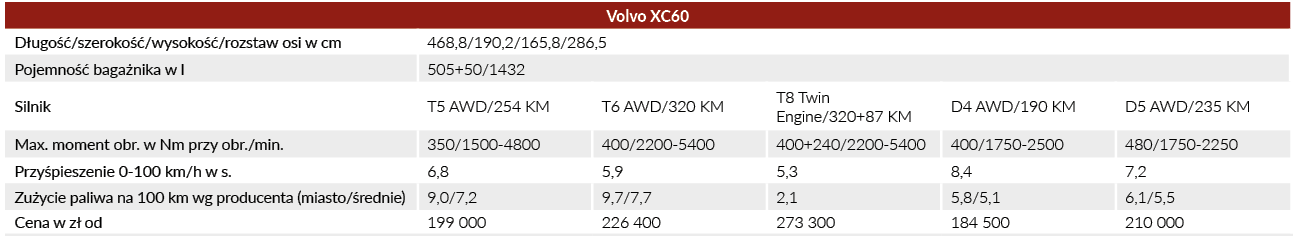 W SUV-ie Volvo, podobnie jak w większym XC90, znajdziemy pod maską wyłącznie 2-litrowe jednostki benzynowe i Diesla w różnych wariantach mocy. Najsłabsze i najtańsze w gamie są diesle: D4 – 190 KM oraz D5 – 235 KM. Wariant D4, na razie jako jedyny, może być dostępny również z 6-biegową mechaniczną skrzynią. Pozostałe warianty korzystają z ośmiobiegowej skrzyni automatycznej firmy Aisin. Najsłabsza wersja D3 o mocy 150 KM pojawi się w późniejszym terMINIe. Więcej mocy oferują jednostki benzynowe: T5 (2.0/254 KM) oraz T6 (2.0/320 KM). Topowym modelem w ofercie jest T8 – z silnikiem hybrydowym, w którym silnik spalinowy o mocy 320 KM współpracuje z jednostką elektryczną o mocy 87 KM. Co istotne wszystkie wersje XC60 mają napęd na cztery koła.