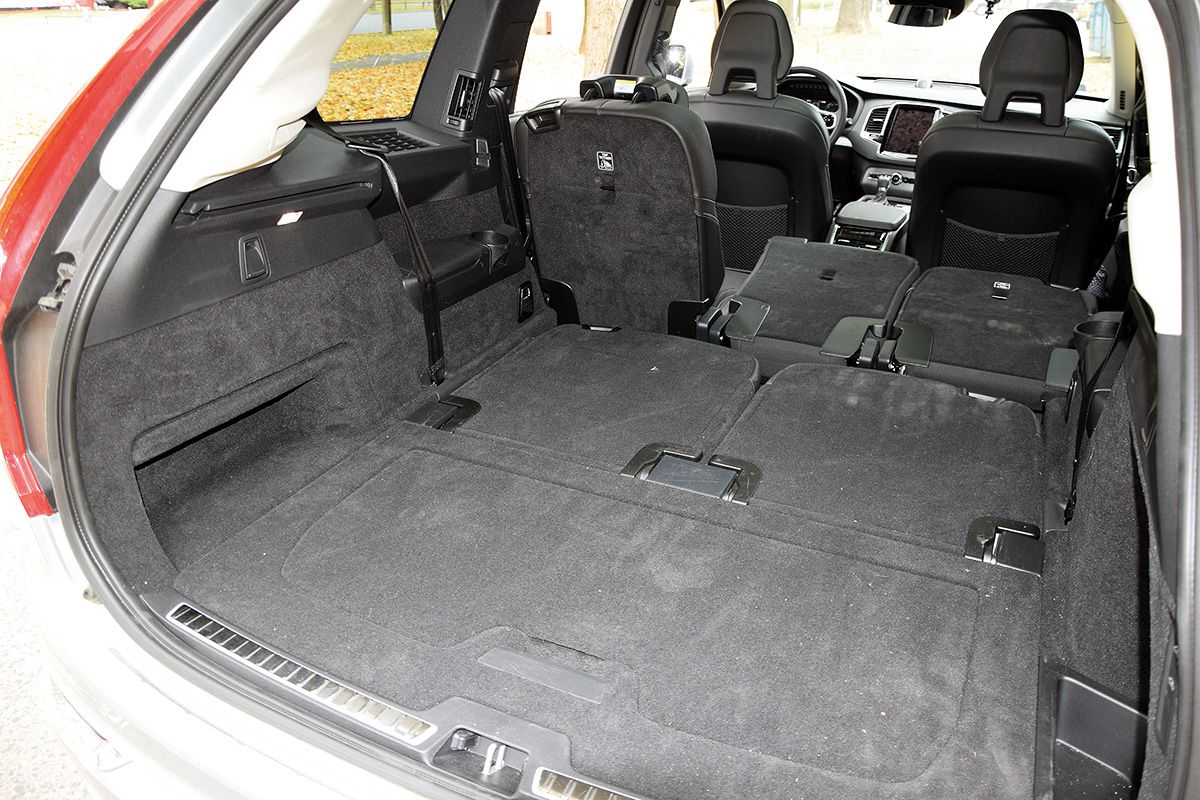 Jak można się było spodziewać, wnętrze imponuje przestronnością, tak z przodu, jak i z tyłu. Znakomicie wyprofilowane fotele, z bardzo szerokim zakresem regulacji, dopełniają całości. Nowe Volvo jest jednym z niewielu SUV-ów oferujących w pełni użyteczne fotele trzeciego rzędu. Zapewnią one wygodną podróż osobom o wzroście do 170 cm. W tym rzędzie pasażerowie mają do dyspozycji nie tylko indywidualne nawiewy, ale też podłokietniki, zamykane schowki i uchwyty na napoje. Szkoda tylko, że zajmowanie tych miejsc wymaga sporej giętkości i ekwilibrystyki. Bagażnik przy komplecie siedmiu pasażerów pomieści 310 l, ale gdy złożymy oparcia drugiego i trzeciego rzędu powiększy się do 1947 l.