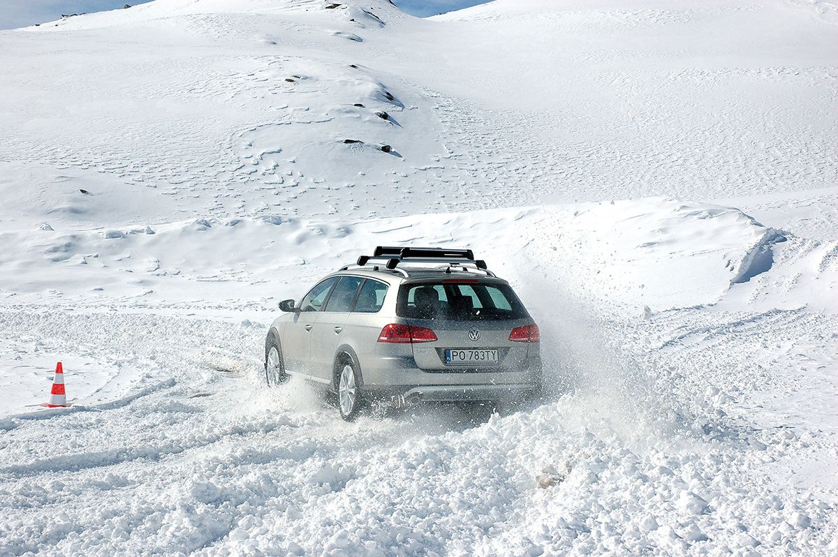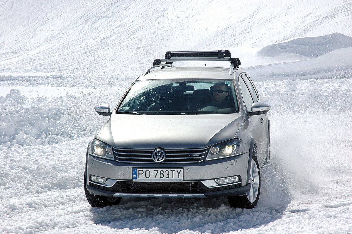 Dlaczego Passat Alltrack ma nie bać się zjechać z asfaltu, dlaczego niestraszne mu nieutwardzone dukty i błotniste leśne dróżki? Co zmieniono w nim w stosunku do normalnego Passata? Po pierwsze zwiększono prześwit ze 135 mm do 165 mm, czyli po prostu podniesiono go o 3 cm. Zwiększyły się też kąty: kąt natarcia wzrósł z 13,5 stopnia do 16 stopni, kąt zejścia wynosi 13,6 stopnia (Passat Variant: 11,9 stopnia). Podczas jazdy w terenie nie mniej ważny jest kąt rampowy, pozwalający na pokonywanie pagórków. W tym przypadku wartość poprawiła się z 9,5 stopnia do 12,8. Jednak najważniejszy wydaje się napęd na wszystkie koła 4 Motion. W mocniejszych wersjach jest to standard, w słabszych – opcja, choć oczywiście kupowanie tego auta „w ośce” nie ma większego sensu. Volkswagen ma dość chlubną historię samochodów czteronapędowych za sprawą stosowania w swoich samochodach sprzęgła wiskotycznego, znanego lepiej jako Syncro – które w swoim czasie sprawdzało się naprawdę nieźle. Tym razem jednak za rozdział napędu między osiami odpowiada sprzęgło Haldex. Warto jednak wspomnieć, że jest to Haldex czwartej generacji, którego działanie jest daleko różne od tego, co znamy z generacji poprzednich, które (ogólnie rzecz biorąc) pozostawiały sporo do życzenia (i nadal pozostawiają, bo w wielu samochodach wciąż je spotkamy). Nie wdając się w zbędne szczegóły techniczne, obecnie rozdziałem mocy steruje komputer, więc nie trzeba czekać, aż przednie koła zaczną się ślizgać, żeby sprzęgło skleiło i tył został dołączony. W nowym Haldeksie wystarczy, że komputer dojdzie do wniosku, iż niedługo może dojść do poślizgu, żeby – nie czekając, aż to nastąpi – dał moc na tylną oś. I to nawet 80% mocy, więc jeśli ktoś (podobnie jak ja) nie uważa za prawdziwe 4x4 niczego, czego nie da się postawić bokiem z gazu, pospieszam uspokoić: Passat Alltrack idzie bokiem aż miło. Każde mocne wciśnięcie gazu jest przez komputer uznawane za powód do przekazywania mocy na tylną oś, więc samochód prowadzi się naprawdę fajnie. Nie ma też problemu z tym, że jeśli za długo pojeździmy z dołączonym tyłem, to system rozłączy napęd, co było utrapieniem poprzednich Haldeksów. Dopóki nie zagotujemy oleju na amen, napęd jest przekazywany, jak należy. A muszę przyznać, że na prezentacji Alltracka daliśmy napędom do wiwatu, jeżdżąc w kółko po śniegu przez ponad pół godziny. Choć temperatura oleju chwilami przekraczała 130 st. C, nie napotkaliśmy żadnych problemów. Choć poprzedniej grupie podobno udało się doprowadzić auto do tego, że odmówiło dalszej współpracy i trzeba było czekać, aż trochę przestygnie. Ale kiedy temperatura wróciła do normy, samochód jeździł dalej i kilka dni później wytrzymał też nasze ekscesy bez narzekania.