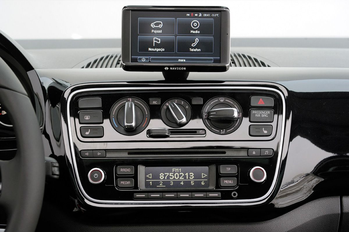 Wsiadając do Up!-a również nie zobaczymy tu niczego znajomego z innych modeli. W oczy rzuca się deska rozdzielcza: świecąca, gładka i elegancka, którą dodatkowo możemy zamówić polakierowaną pod kolor nadwozia. Lakierowana blacha drzwi, które częściowo nie są pokryte tapicerką, świetnie komponuje się z deską rozdzielczą i nie sprawia nieprzyjemnego wrażenia. Up! to samochód z najmniejszego segmentu dostępnego na rynku, jednak miejsca dla pasażerów w środku mógłby Up!-owi pozazdrościć niejeden większy rywal. Dzięki bardzo dużemu rozstawowi osi, a także sporemu rozmiarowi (jak na tę klasę) nadwozia, mały Volkswagen bez problemu zmieści 4 osoby, co osobiście przetestowaliśmy. Nawet dłuższa podróż kompletu dorosłych pasażerów nie sprawi większego problemu. W Up!-ie rewelacyjne wprost są przednie siedzenia z zintegrowanymi zagłówkami. Siadając na nich, od razu czujemy, że jesteśmy na swoim miejscu. Zapewniają bardzo dobre trzymanie boczne, a także odpowiedni komfort podróżowania. Bagażnik zaprojektowano tak, by wygodnie przewozić w nim małe, codzienne bagaże: materiały biurowe czy kilka segregatorów. Bagażnik ma dwie podłogi, a także funkcjonalne haczyki do wieszania zakupów. 250 litrów, które oferuje przestrzeń ładunkowa, to naprawdę sporo jak na tę klasę. Up! pełen jest ciekawych rozwiązań i gadżetów. Jedną z ciekawostek jest opcjonalna nawigacja wraz z komputerem pokładowym – Maps&Go. Mając ten zestaw, z pewnością możemy zrezygnować z naszej starej nawigacji. Ta zamontowana na konsoli środkowej pokaże trasę dojazdu, wszystkie opcje związane z pracą samochodu, a także wskazówki dotyczące ekonomicznej jazdy. Do tego, kiedy schowamy ją do kieszeni, pokaże drogę powrotną do zaparkowanego samochodu. Cena pakietu jest naprawdę atrakcyjna i wynosi zaledwie 1250 zł. Równie ważny jest pakiet Cool&Sound. Za cenę około 2000 zł otrzymujemy klimatyzację i całkiem przyjemne nagłośnienie. W Up!-ie znajdziemy sporą liczbę schowków i pó-