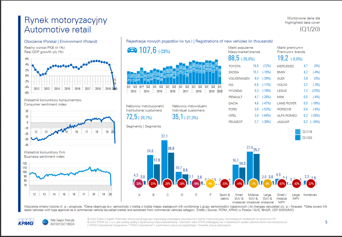 Już po wynikach pierwszego kwartału widać, że wpływ pandemii na branżę motoryzacyjną będzie bardzo duży. Szacunki mówią, że w drugim kwartale średni spadek sprzedaży wszystkich pojazdów może wynieść nawet 60-70%. Dotyczy to również segmentu premium, bo choć w momentach spadków sprzedaży samochody premium na ogół sprzedawały się lepiej - tym razem mamy do czynienia z sytuacją nigdy wcześniej nie spotykaną. Obecnie większość firm wstrzymuje się z zakupami i wymianą flot, w tym samochodów premium, które były nabywane dla top managementu. Zakładając, że w ciągu najbliższych kilku miesięcy sytuacja zacznie się stabilizować, jest nadzieja, że w trzecim i czwartym kwartale spadki będą niższe niż w drugim, jednak na powrót do stanu sprzed pandemii nie należy liczyć – mówi Jakub Faryś, Prezes Polskiego Związku Przemysłu Motoryzacyjnego.