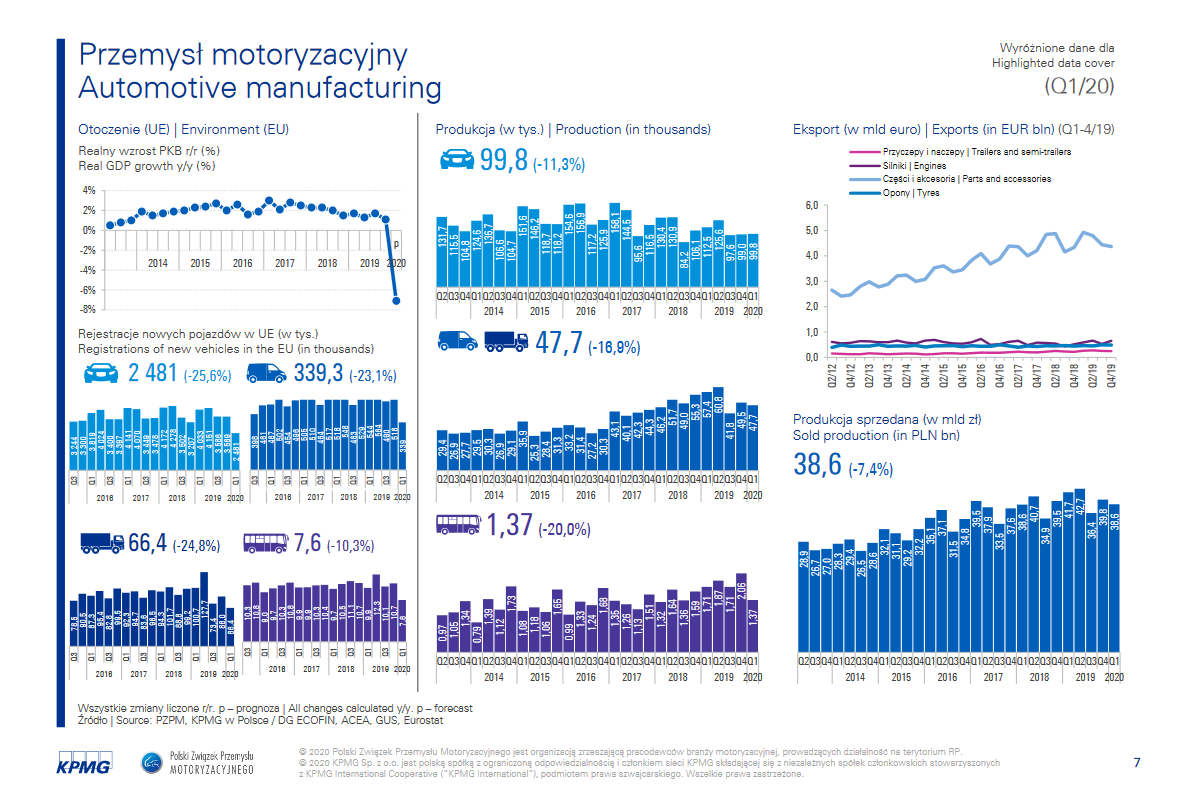 Dynamicznie rośnie liczba rejestracji samochodów elektrycznych. Polacy zarejestrowali ich ponad dwa razy więcej niż w analogicznym okresie ubiegłego roku. W całym 2019 r. eksport produktów motoryzacyjnych z Polski wzrósł o 4% r/r, przy czym wartość eksportu samochodów osobowych zmniejszyła się o 1,2%. W I kwartale 2020 r. ulokowane w Polsce fabryki motoryzacyjne wypracowały gorszy wynik. Z taśm montażowych zjechało w tym czasie 148,9 tys. pojazdów samochodowych, co oznaczało spadek aż o 13,2% względem analogicznego okresu poprzedniego roku.