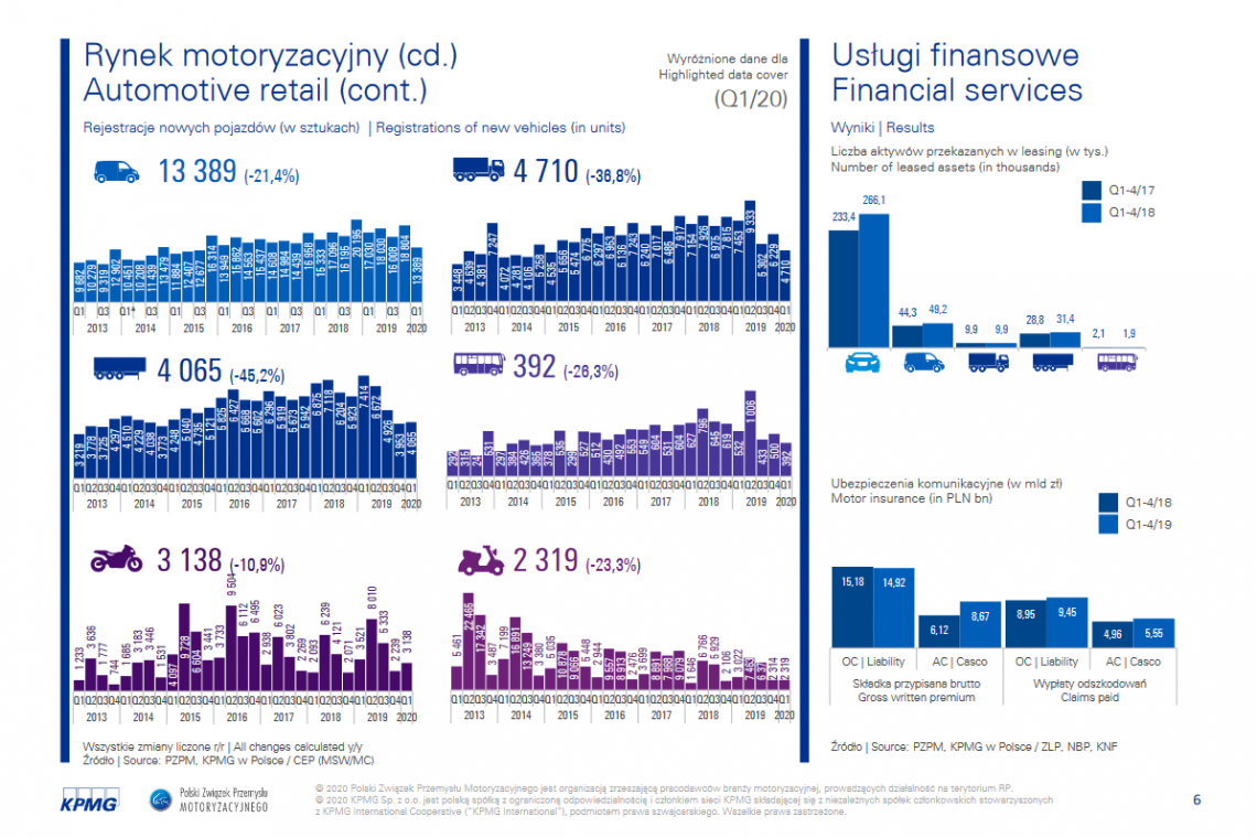 W I kwartale 2020 r. zarejestrowano 13,4tys. sztuk nowych samochodów dostawczych, co oznaczało spadek o 21,4% w porównaniu do I kwartału 2019 r. Aż o36,8% r/r, do poziomu 4,7 tys. sztuk, zmniejszyły się rejestracje samochodów ciężarowych. Rynek nowych przyczep i naczep o masie całkowitej powyżej 3,5t spadł z kolei o 45,2% – w I kwartale zarejestrowano 4 tys. sztuk.