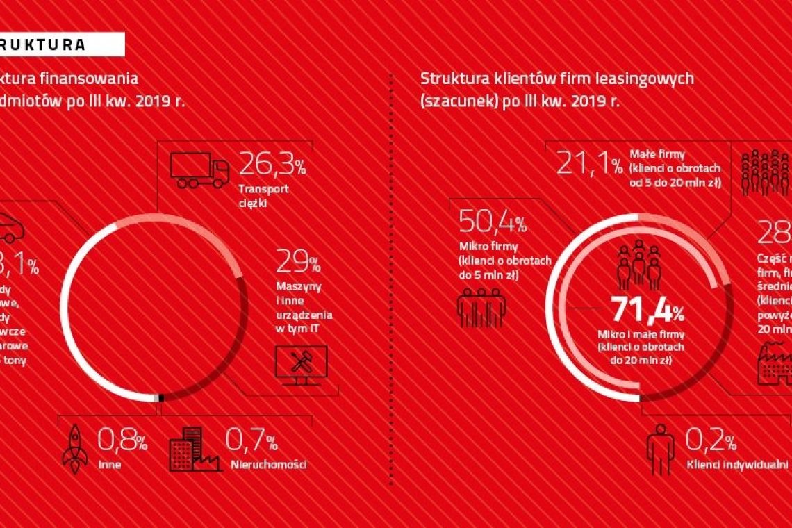Szacunki Związku Polskiego Leasingu pokazują, że największą, bo liczącą ok 71,4 proc. grupę korzystających z leasingu stanowią klienci o obrotach do 20 mln zł. Do tej grupy zaliczane są mikro i małe firmy. 28,3% stanowią klienci o obrotach powyżej 20 mln zł, a klienci indywidualni 0,2%. Finansowanie sektora publicznego w dalszym ciągu pozostaje marginalne.