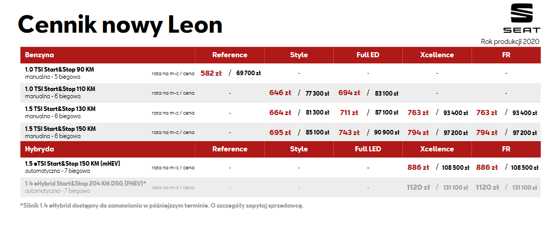 Po raz pierwszy SEAT Leon oferowany będzie również z silnikiem hybrydowym. Ceny dla wersji FR oraz Xcellence wyposażonej w silnik 1.5 eTSI 150 KM (mHEV) rozpoczynają się od 108 500 zł, zaś w przypadku nadwozia Sportstourer – od 112 100 zł. Hybryda typu „plug-in” dostępna będzie w drugiej połowie 2020 roku.