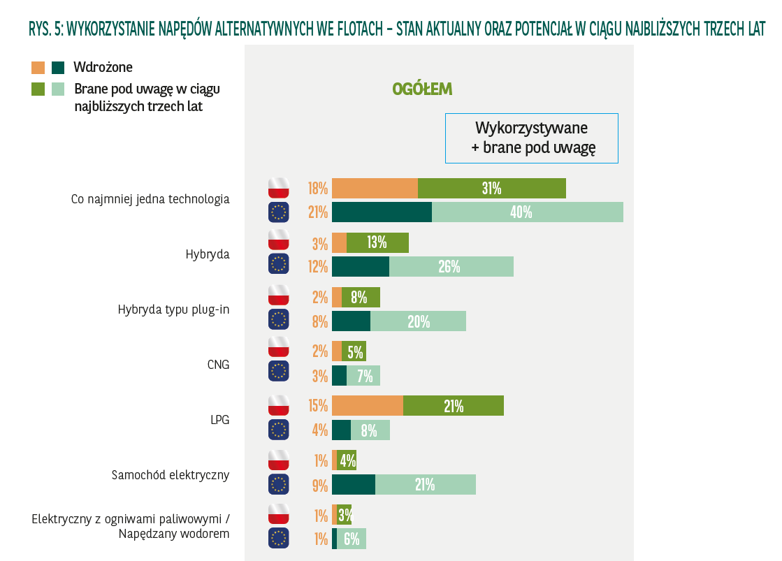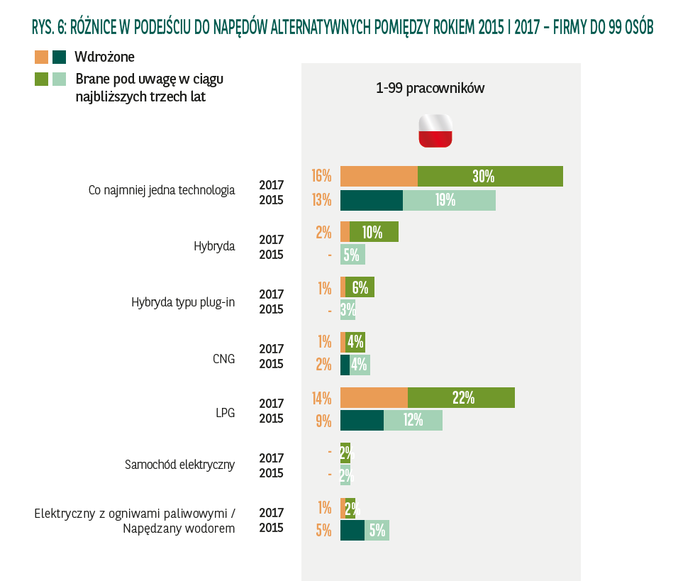 W Barometrze Flotowym 2017 duży nacisk został położony na zbadanie aktualnego stanu wykorzystania napędów alternatywnych oraz przewidywanych przez menedżerów zmian w tym zakresie. Zgodnie z wynikami, 13% fleet menedżerów w Polsce i 19% w pozostałych państwach europejskich rozważa, w ciągu najbliższych trzech lat, skorzystanie z przynajmniej jednej technologii alternatywnej dla klasycznego napędu spalinowego.
