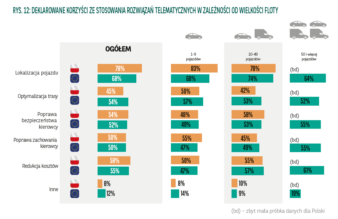 Lata 2016 i 2017 są pod wieloma względami przełomowe dla polskiego rynku rozwiązań telematycznych. Ich wykorzystanie we flotach samochodowych w Polsce jest wyraźnie wyższe niż w innych krajach europejskich objętych badaniem CVO. Wdrożono je w 35% polskich flot – to blisko dwa razy więcej niż w pozostałych krajach.