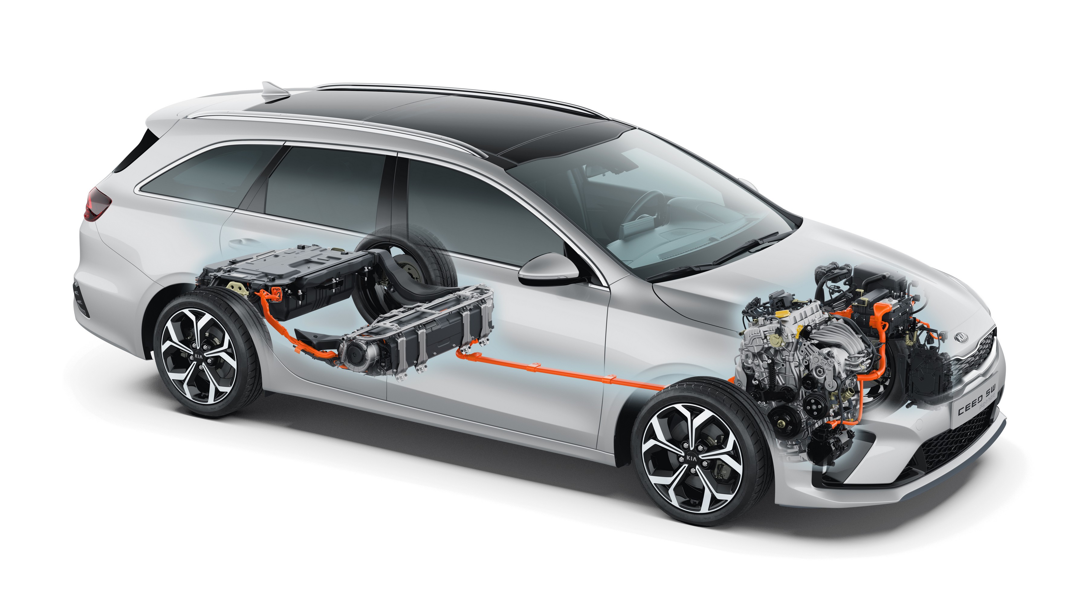 - hybrydowy układ napędowy typu plug-in w modelach Ceed kombi i XCeed składa się z litowo-jonowego akumulatora o pojemności 8,9 kWh, silnika elektrycznego o mocy 44,5 kW i benzynowej jednostki napędowej 1.6 GDI – łączna moc wynosi 141 KM