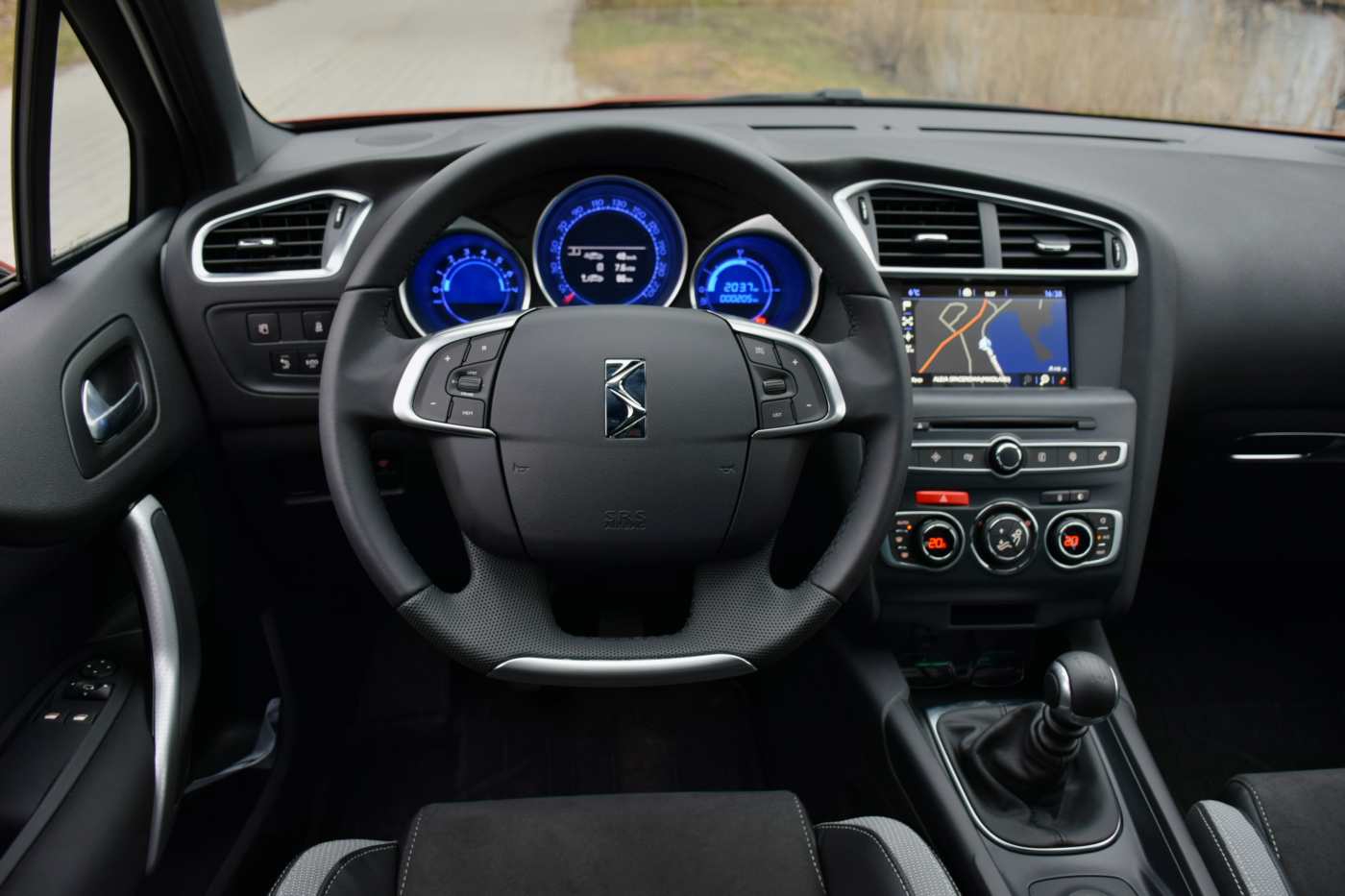 DSC_7925Wnętrze DS4 zmieniło się w niewielkim stopniu. DS4 nadal wyróżnia się w segmencie panoramiczną zachodzącą na dach przednią szybą, ze zsuwanymi z podsufitki roletami, na których zamontowano osłony przeciwsłoneczne. Tak jak wcześniej mamy możliwość podświetlania zegarów w klasycznym białym kolorze lub w różnych odcieniach niebieskiego. Na kierownicy pojawiło się logo DS, minimalnie zmniejszono liczbę przycisków na środkowej konsoli a poprzez 7-calowy ekran dotykowy możemy realizować większą liczbę funkcji. Nowością jest wyposażenie pojazdu w protokół CarPlay, dzięki czemu pojazd jest kompatybilny z urządzeniami iPhone. Mamy oczywiście możliwość wyświetlania aplikacji i danych z ekranu smartfona na dotykowym tablecie auta, a także np. redagowania wiadomości SMS za pomocą funkcji rozpoznania głosu. W ramach DS Connect Box w samochodzie mogą być dostępne cztery pakiety usług: Assistance (z systemem powiadamiana służb w razie wypadku), Monitoring (wirtualna książka przeglądów, dane i porady w zakresie eco-drivingu), Mapping (lokalizacja pojazdu i zbieranie danych o wyjeździe i wjeździe do danej strefy) a także Tracking, czyli geolokalizacja, przydatna w momencie kradzieży.
