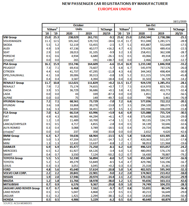 W październiku 2020r. rynek samochodów osobowych w UE ponownie osunął się, po opublikowaniu pierwszego wzrostu we wrześniu br. Rejestracje nowych samochodów w ostatnim miesiącu obniżyły się o 7,8% do 953 616 sztuk, gdy kilka europejskich rządów ponownie nałożyło ograniczenia, aby walczyć z drugą falą koronawirusa.