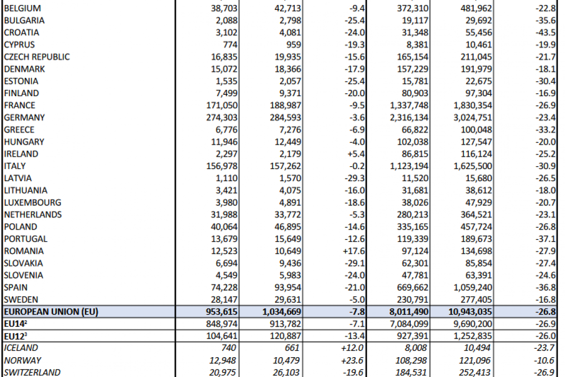 Od stycznia do października br. liczba rejestracji nowych samochodów spadła w Unii Europejskiej o 26,8%. W ciągu dziesięciu miesięcy od początku roku wpływ COVID - 19 na popyt na samochody pozostaje bezprecedensowy. Rzeczywiście, w całej UE od stycznia do października zarejestrowano około 8 milionów samochodów osobowych, co przekłada się na spadek o ponad 2,9 mln sztuk w porównaniu z analogicznym okresem ubiegłego roku. Patrząc na największe rynki UE w tym roku, Hiszpania odnotowała jak dotąd najostrzejszy spadek (-36,8%), następnie Włochy (-30,9%), Francja (-26,9%) i Niemcy (-23,4%).