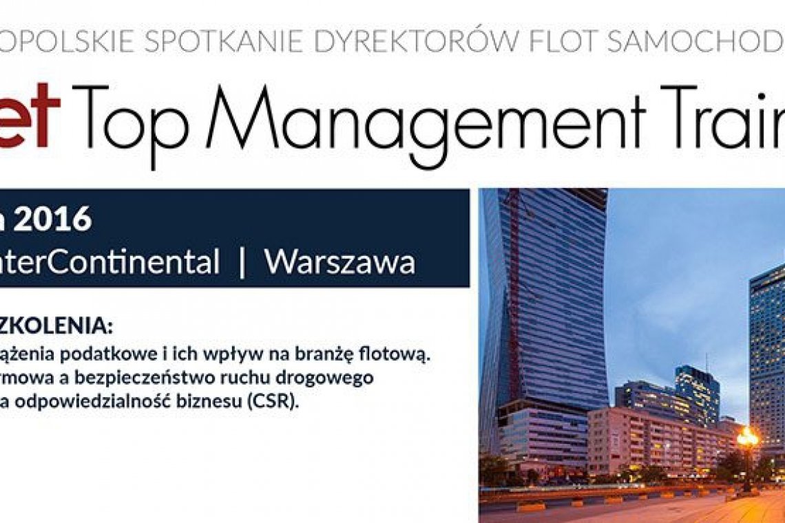 Już 18 maja br. odbędzie się ogólnopolskie spotkanie dyrektorów i decydentów flotowych odpowiedzialnych za zarządzanie samochodami firmowymi - Fleet Top Management Training, podczas którego zaproszeni eksperci opowiedzą m.in. o tym, jaki wpływ na branżę motoryzacyjną będą miały nowe przepisy podatkowe.
