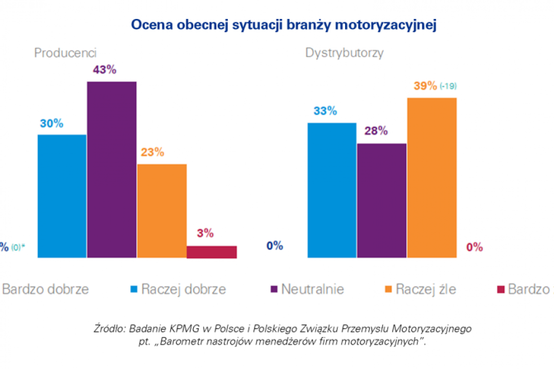 Dystrybutorzy motoryzacyjni obecni w Polsce przejawiają nieco większy pesymizm niż producenci w kwestii oceny obecnej sytuacji w branży motoryzacyjnej. Blisko 40% firm zajmujących się dystrybucją negatywnie ocenia obecną sytuację branży, ale co 3. dystrybutor sytuację w branży ocenia dobrze.