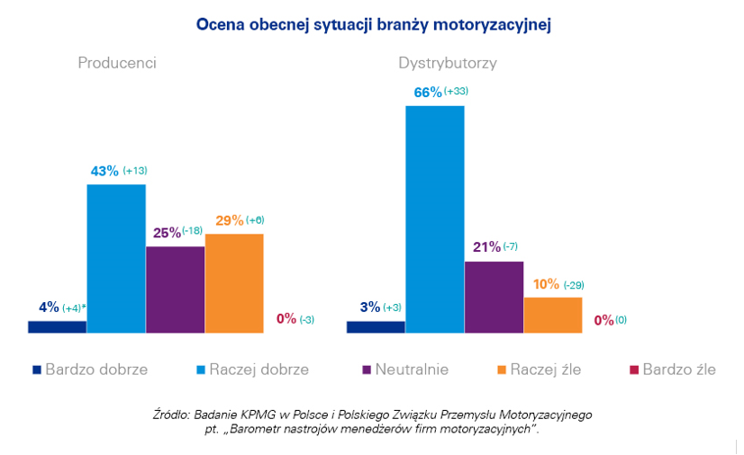 Od początku roku wzrósł odsetek przedstawicieli firm motoryzacyjnych, którzy prognozują poprawę koniunktury w branży w ciągu kolejnych 12 miesięcy. 65% ankietowanych producentów oraz 59% przedstawicieli dystrybutorów prognozuje, że sytuacja w branży ulegnie poprawie lub zdecydowanej poprawie. Z kolei blisko 1/3 zarówno dystrybutorów, jak i producentów uważa, że sytuacja sektora motoryzacyjnego przez najbliższy rok nie ulegnie zmianie.