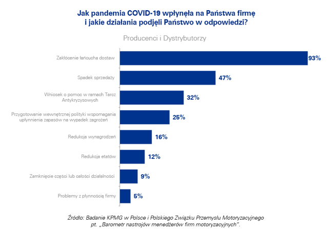 Ponad 9 na 10 firm biorących udział w badaniu KPMG i PZPM deklaruje, że w wyniku pandemii COVID-19 ich firmy mierzą się z negatywnymi skutkami zakłócenia łańcucha dostaw. Blisko połowa przyznaje, że negatywnym następstwem pandemii jest również spadek sprzedaży.