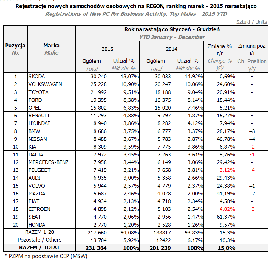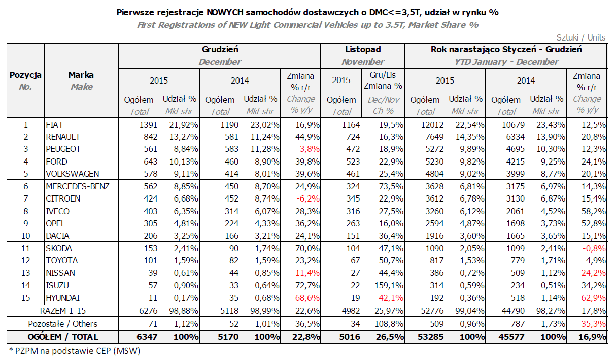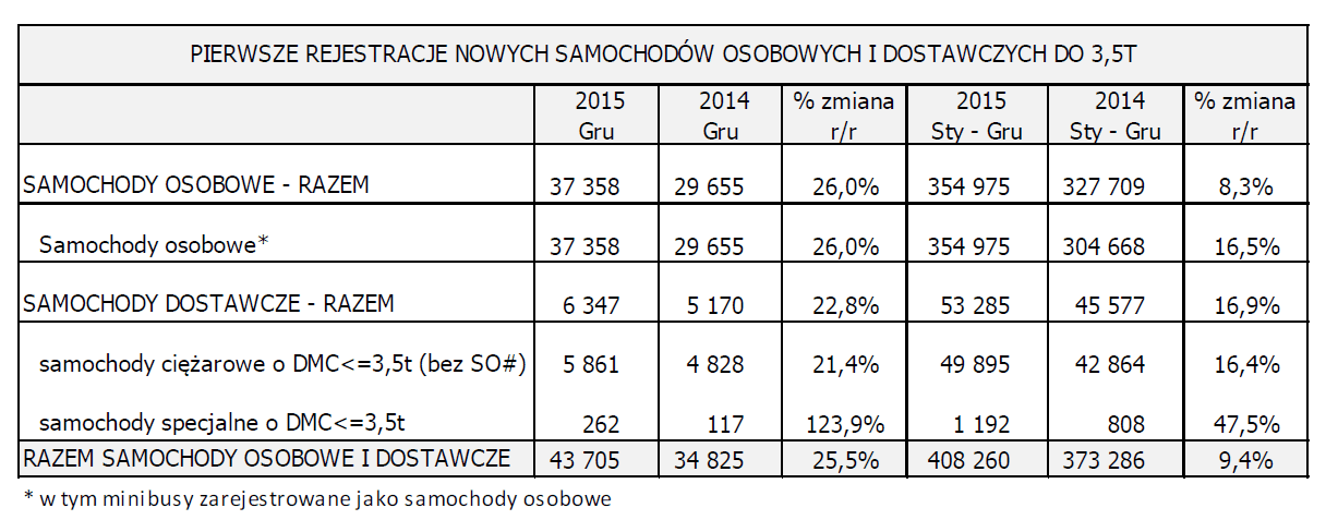 Ostatni miesiąc 2015 zamknął się wynikiem 43 705 nowych rejestracji samochodów osobowych i dostawczych. Jest to poziom o ponad ¼ wyższy (25,5%) niż w grudniu poprzedniego roku i wyższy o ¼ niż w listopadzie 2015. Do rekordowego grudnia 2010, zabrakło ponad 3 tys. Tempo wzrostu wśród samochodów osobowych (26%), odwrotnie niż w poprzednich miesiącach przewyższyło wypracowane w grupie samochodów dostawczych (22,8%).