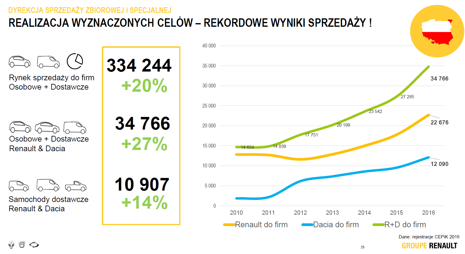 Obie marki Grupy Renault (Renault i Dacia) w 2016 roku zarejestrowały łącznie 51 478 samochodów, to jest o 10 041 samochodów więcej niż w roku poprzednim. To pozwoliło Grupie Renault osiągnąć 10,8% udziałów w rynku samochodów osobowych i dostawczych w Polsce. Tym samym na rynku samochodów osobowych i dostawczych, który wzrósł o 17%, sprzedaż Renault wzrosła o 21%, a Dacii o 29%, co pozwoliło na zwiększenie udziału w rynku o 0,7 p.