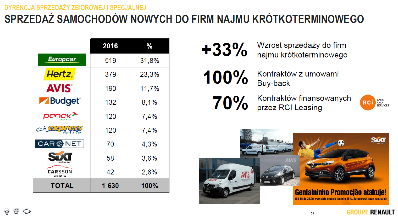 Największe floty samochodów koncernu Renault odebrały w zeszłym roku Orange (380 szt.), Sanofi (340 szt.), Netia (250 samochodów) oraz Polpharma (230 szt.). Grupa Renault w większym stopniu zaistniała w firmach wynajmu krótkoterminowego, które zamówiły w zeszłym roku 1630 szt. samochodów marek Renault i Dacia.