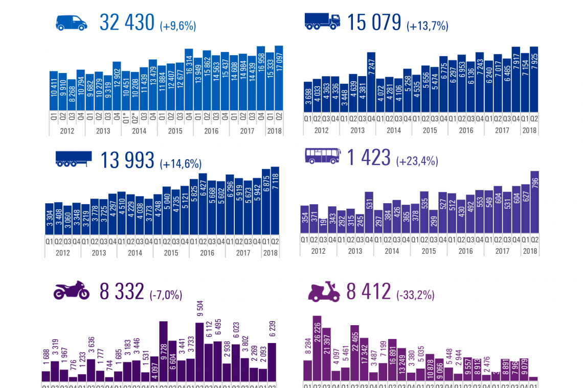 W pierwszej połowie 2018 r. odnotowano wzrost w segmencie samochodów dostawczych (o DMC <=3,5t), których zarejestrowano 32,4 tys., czyli o 9,6% więcej w porównaniu do analogicznego okresu 2017 r. Rynek nowych przyczep i naczep zwiększył się o blisko 15% – w pierwszej połowie 2018 r. zarejestrowano 13,9 tys. sztuk. O 23,4% wzrosła także liczba rejestracji nowych autobusów, która w pierwszej połowie 2018 r. wyniosła 1 423 sztuki. Do wzrostu całej grupy przyczyniły się autobusy miejskie.