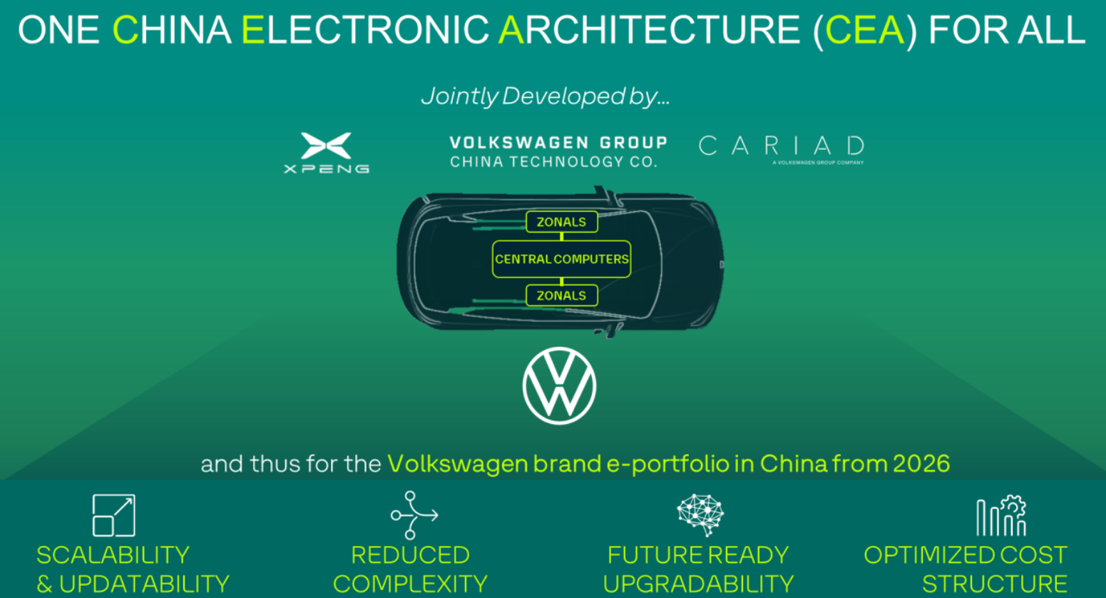 To między innymi nowa architektura China Electronic Architecture (CEA) samochodów elektrycznych (E/E) stworzona wspólnie z firmą Cariad i Xpeng. Została stworzona i przystosowana do lokalnych modeli uwaga w 18 miesięcy.
