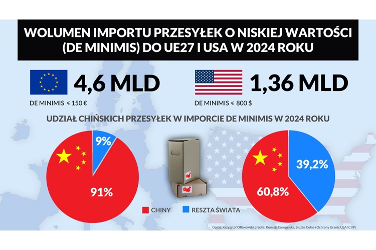 W 2024 r. UE zaimportowała 4,6 mld tanich paczek zwolnionych z cła. W USA wolumen takich przesyłek osiągnął 1,36 mld. Większość to zamówienia e-commerce z Chin, w Unii to 91%, w USA 60,8%, ale nadchodzi koniec zasady de minimis w imporcie i będzie to rewolucja w e-handlu i logistyce. Choć bilans zysków i strat nie jest jeszcze dokładnie znany, to najpewniej straci lotnictwo, zyska logistyka kontraktowa, ale podrożeją e-zakupy, nawet o 62 euro rocznie. Oznacza to, że wyczekiwana stabilizacja nie nastąpi, należy się raczej przygotować na dynamiczne zwroty akcji i historie, jak ta o zwycięstwie chińskich paczek nad amerykańskimi celnikami.