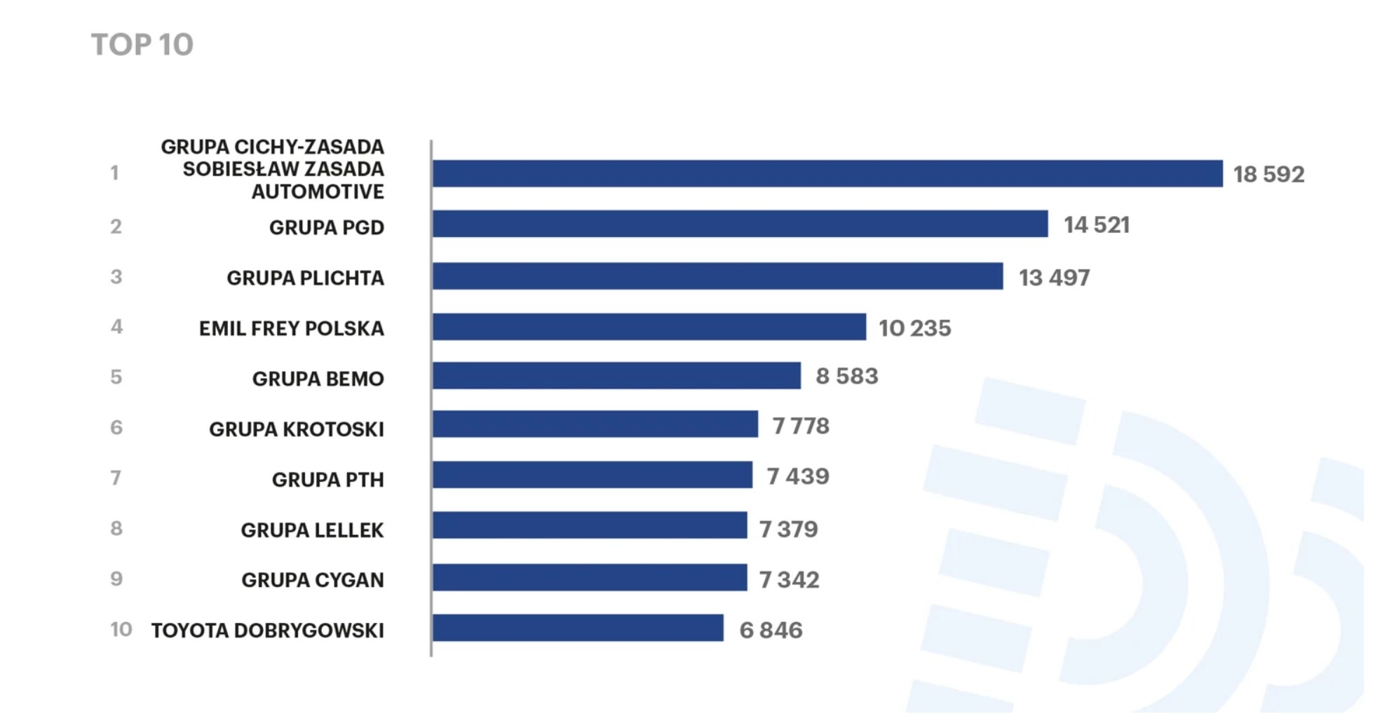 Grupa Cichy-Zasada/Sobiesław Zasada Automotive mimo prawie 10-proc. spadku sprzedaży grupa utrzymała pierwsze miejsce z wolumenem na poziomie 18,6 tys. nowych pojazdów. Znacznie większą aktywność w 2022 r. wykazywała druga w tabeli Grupa PGD. Na początku roku wolumenowy numer 2 poszerzył sieć o dwa nowe punkty w aglomeracji wrocławskiej – jedyny w okolicy salon Mitsubishi oraz stację Forda. W Krakowie i Warszawie firma otworzyła punkt sprzedaży marki Cupra, a już w 2023 r. dealerską mapę stolicy uzupełniły obiekty Opla i DS Automobiles. Ten rok w wykonaniu PGD zostanie jednak zapamiętany głównie przez pryzmat przejęcia firmy RRG Warszawa.