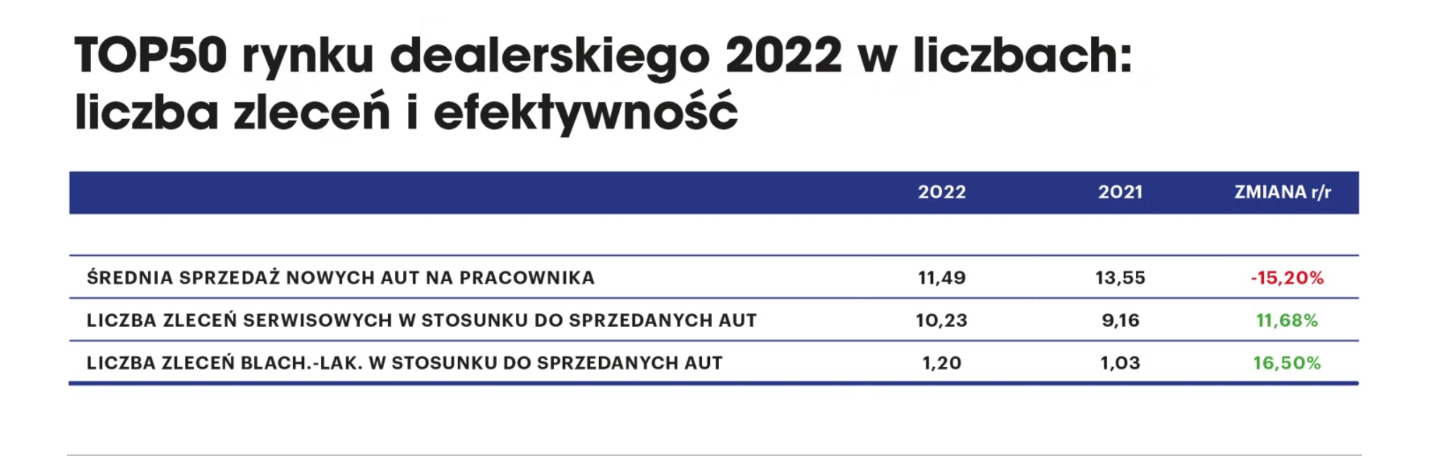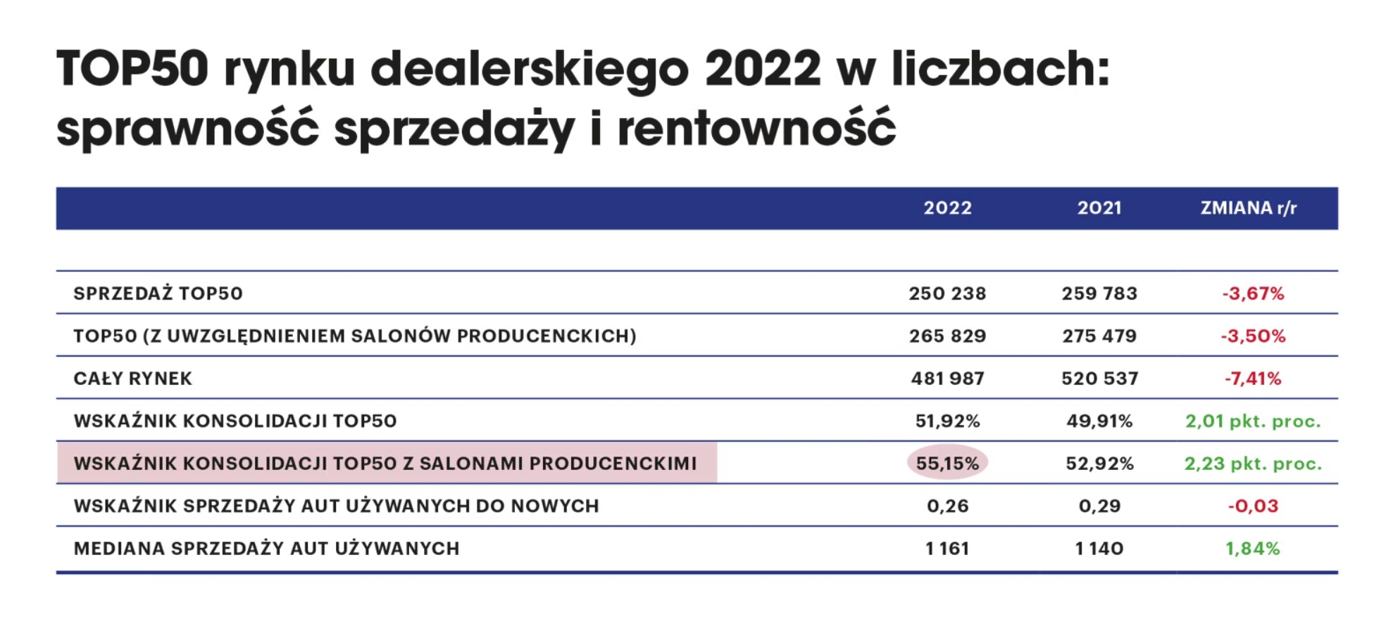 Jak wskazują redaktorzy magazynu Dealer oprócz wskaźnika konsolidacji wzrósł także udział największych graczy w ogóle wszystkich autoryzacji na polskim rynku – o ile rok wcześniej TOP50 skupiało pod sobą 41 proc. rynku, w 2022 r. wartość ta wzrosła już do 44 proc., po części także za sprawą „debiutu” kilku elektrycznych marek z Chin – Seresa, Maxusa czy Skywella. Poszerzanie markowego portfolio o niszowe brandy negatywnie wpłynęło natomiast na średnią liczbę aut sprzedawanych na pojedynczą autoryzację. Dealerzy z TOP50, którzy jeszcze przed rokiem byli bliscy sforsowania bariery „pięćsetki”, w tym roku musieli zadowolić się wynikiem 418 aut.