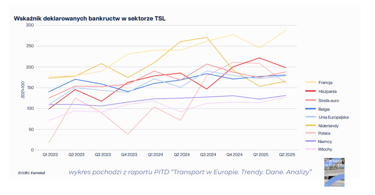 Twarde dane potwierdzają te słowa. W II kwartale indeks bankructw dla firm transportowych w UE sięgnął 178,7 pkt, co oznacza niemal podwojenie liczby upadłości względem poziomów sprzed pandemii. Do tego dochodzi załamanie rejestracji nowych ciężarówek – w Niemczech, czyli sercu europejskiego transportu, spadek wyniósł aż -27,5% r/r. To prosta droga do jeszcze większych braków mocy.