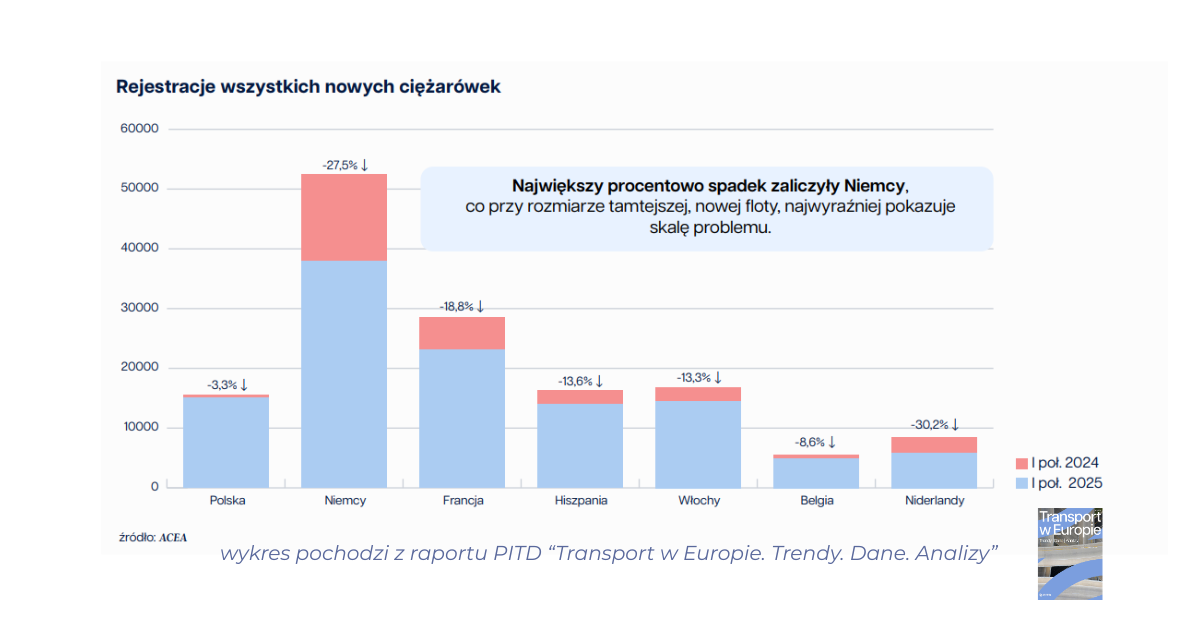 4. Zwróć uwagę na Niemcy – rejestracje ciężarówek spadły tam aż o -27,5%. To zapowiedź jeszcze większych braków mocy na zachodzie.