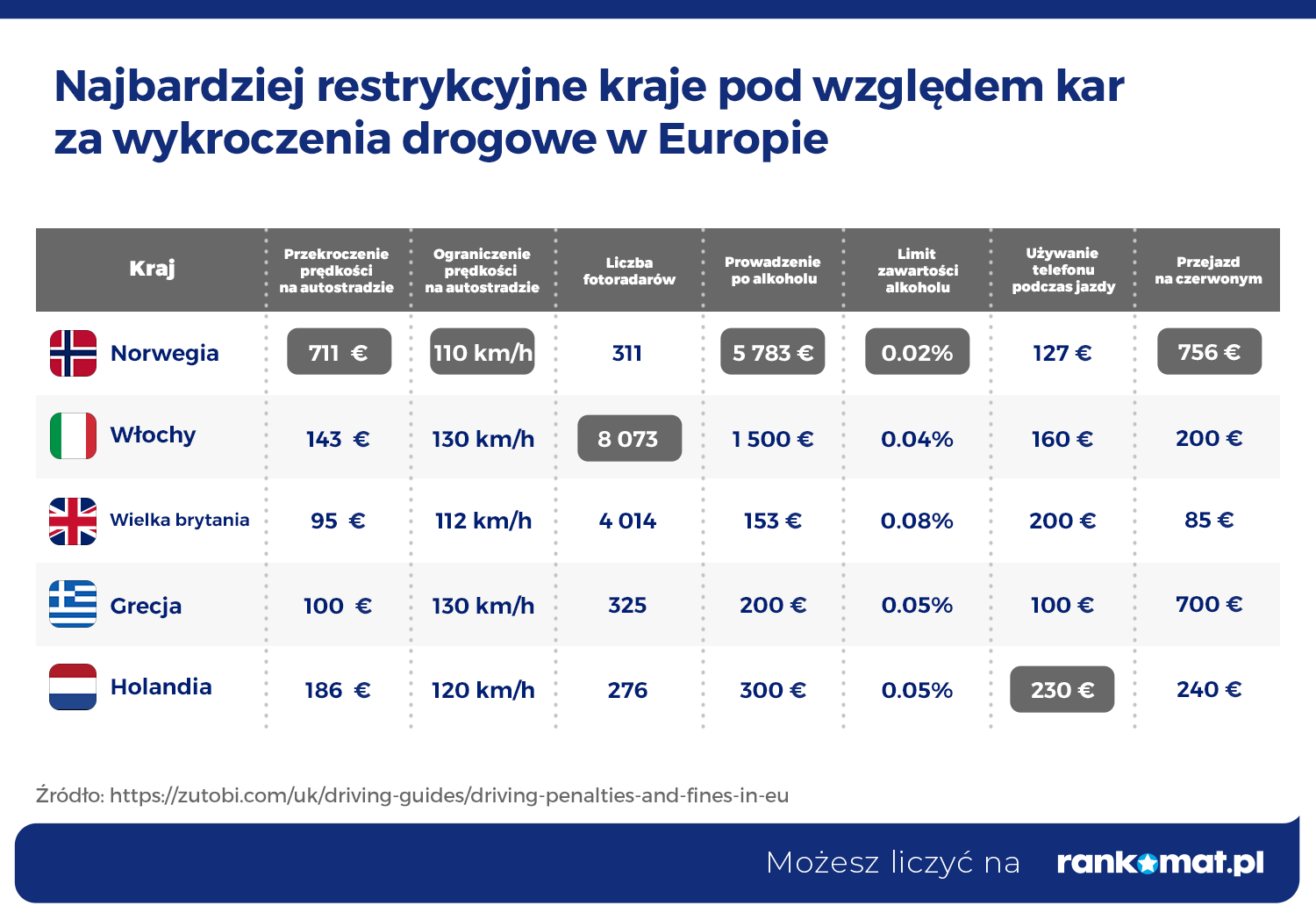Eksperci rankomat.pl przeanalizowali zestawienie przygotowane przez Zutobi Drivers Ed, wg którego Polska znajduje się w czołowej piątce najłagodniejszych krajów w Europie, jeśli chodzi o kary za wykroczenia drogowe. Najsurowszym krajem wobec piratów drogowych jest Norwegia. Za przekroczenie prędkości na autostradzie grozi minimalna kara 711 euro, za przejazd na czerwonym świetle 756 euro, a za jazdę po pijaku - 5783 euro. Do 0,5‰ zawartości alkoholu we krwi skończy się grzywną. Powyżej tej wartości do 1‰ oprócz wysokiej grzywny dostaniemy karę pozbawienia wolności w zawieszeniu. Zawartość alkoholu we krwi ponad 1‰ to gwarantowana kara więzienia.