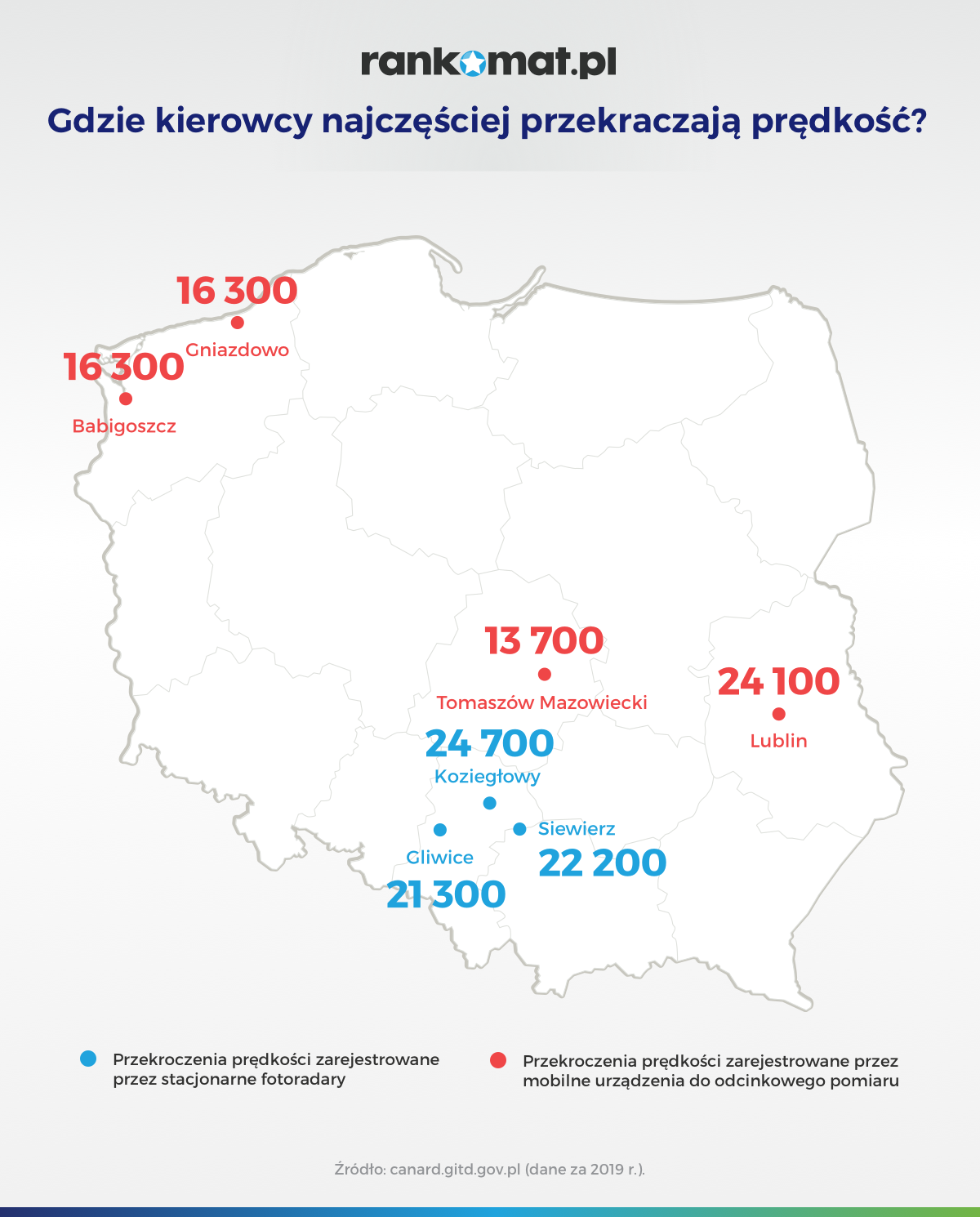 W 2019 r. stacjonarne fotoradary największą liczbę kierowców przekraczających dopuszczalną prędkość zarejestrowały w trzech miejscowościach województwa śląskiego. W Koziegłowach (24 700 przypadków), a także w Siewierzu (22 200) oraz Gliwicach (21 300). Natomiast mobilne urządzenia do odcinkowego pomiaru prędkości, najczęściej na zbyt szybkiej jeździe przyłapały kierujących w Lublinie (24 100).