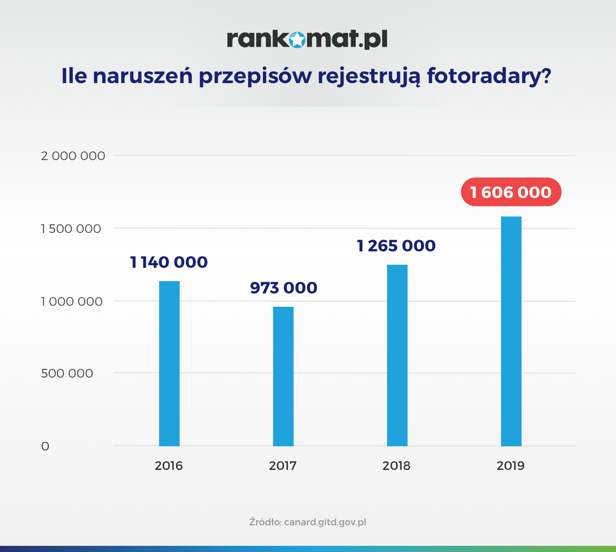 W 2019 r. fotoradary zarejestrowały 1 606 000 naruszeń przepisów drogowych. To o 341 000 więcej niż w 2018 r. (+27%). Z kolei w ciągu ostatnich czterech lat najmniej kierowców przyłapano na nieprzepisowej jeździe w 2017 r. (973 000).
