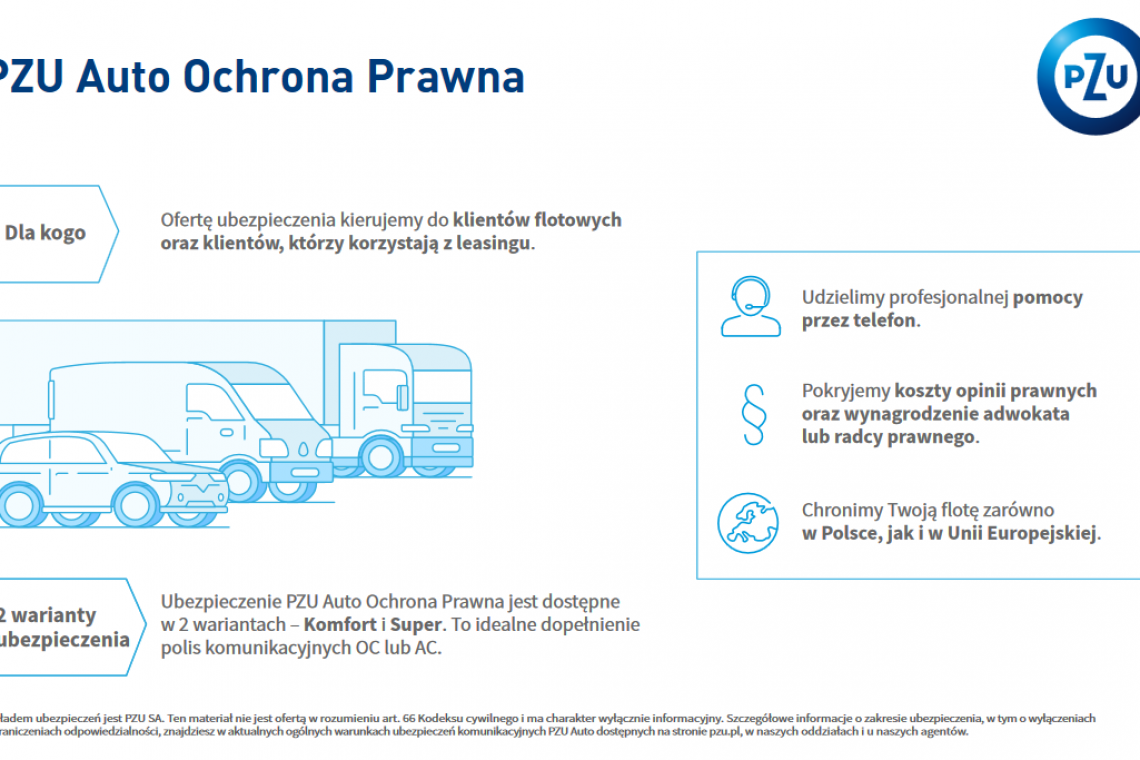 Od połowy września PZU Auto ma dodatkowy wariant ubezpieczenia Ochrony Prawnej. Dotychczas z oferty PZU Auto Ochrona Prawna mogli korzystać jedynie klienci indywidualni. Dostrzegając potencjał wykorzystania takiego produktu wśród przedsiębiorców, rozbudowano go i udostępniono dla flot i leasingów.