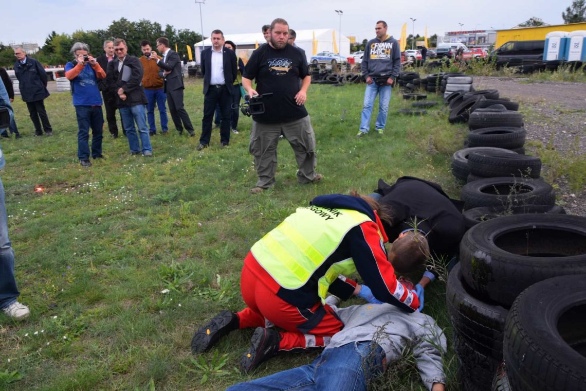 DSC 0049Dzięki błyskawicznej akcji ratowniczej na miejscu zdarzenia szanse przeżycia poszkodowanych w wypadku rosną o aż 75%. Opóźnienie w udzieleniu pierwszej pomocy o zaledwie minutę powoduje spadek szans na przeżycie o 10%. Chociaż brzmi to nielogicznie, w pierwszej kolejności po przybyciu na miejsce wypadku trzeba zadbać o... bezpieczeństwo własne, a dopiero w następnej kolejności zajmować się poszkodowanymi. Samochód powinno się zaparkować na poboczu i w miejscu, w którym będzie dobrze widoczny dla aut nadjeżdżających z każdego kierunku. Nie należy pozostawiać samochodu na drodze, bo za chwilę może być przyczyną kolejnego wypadku. Dopiero po włączeniu w samochodzie świateł awaryjnych, wystawieniu trójkąta ostrzegawczego i założeniu kamizelki odblaskowej powinno się sięgnąć po apteczkę. W tak zabezpieczonym miejscu wypadku można zabierać się za udzielanie pomocy poszkodowanym.Do pierwszych czynności w miejscu wypadku należy ocena potencjalnych zagrożeń – przede wszystkim tego, czy poszkodowani są bezpieczni (nie mają kontaktu z płynami ustrojowymi, nie są narażeni na odniesienie dalszych obrażeń z powodu przebywania w pobliżu niebezpiecznych przedmiotów, np. rozsypanego szkła i czy nie ma w pobliżu niebezpiecznie zachowujących się osób – np. przebywających w szoku świadków wypadku). Bardzo istotną czynnością podczas zabezpieczenia miejsca zdarzenia jest wyciągnięcie kluczyka ze stacyjki uszkodzonego samochodu lub samochodów, ale pozostawienie go w kabinie.Jeśli stwierdzimy, że poszkodowanym zagraża niebezpieczeństwo, natychmiast powinniśmy wezwać odpowiednie służby. Podstawowy numer ratunkowy, pod który trzeba zadzwonić to 112. Taki numer ratunkowy obowiązuje na terenie całej Unii Europejskiej i – co ważne – połączenie z operatorem jest bezpłatne i możliwe nawet jeśli nie mamy w telefonie aktywnej karty SIM. Inne ważne numery telefonów w Polsce to – 999 (Pogotowie), 998 (Straż pożarna) i 997 (Policja).DSC 0053„Jeżeli dysponujemy środkiem łączności i chcemy wezwać pomoc – to co należy powiedzieć? Po pierwsze „gdzie", następnie „ile osób" i „co się stało". Kolejność informacji zachowana jest na wypadek niespodziewanego przerwania połączenia." – tłumaczy dr Adam Pietrzak, koordynator służb ratowniczych.Jeśli na miejsce zdarzenia nie przybyliśmy pierwsi i ktoś już próbuje „dowodzić" akcją ratowniczą, „dyryguje" innymi i jednocześnie zabrania zbliżać się do poszkodowanych, aby im nie zaszkodzić, absolutnie nie należy takiej osobie ufać. Statystyki pokazują, że zdecydowanie więcej poszkodowanych w wypadkach umiera, bo nie udzielono im żadnej pomocy niż wskutek tego, że udzielono jej nie do końca perfekcyjnie.W pierwszym kontakcie z poszkodowanymi należy ustalić czy są przytomni. Trzeba do nich ostrożnie podejść, delikatnie potrząsnąć za ramiona i głośno zapytać „Czy wszystko w porządku?" Następnie powinno się poszkodowanym udrożnić drogi oddechowe i ocenić czy oddychają. U osób z widocznymi obrażeniami należy zatamować krew, ale trzeba mieć też na uwadze możliwość występowania u poszkodowanych krwotoku wewnętrznego. Poszkodowani, będąc w szoku i pod wpływem adrenaliny, do kilku minut po wypadku mogą nie odczuwać nawet poważnych dolegliwości.„Jednym z założeń chroniących poszkodowanych przed powikłaniami ratowniczymi i transportowymi jest traktowanie wszystkich rannych, tak jakby doznali urazu kręgosłupa (zwłaszcza w odcinku szyjnym). Jeżeli przed wyciągnięciem z wnętrza samochodu, ranny nie miał założonego kołnierza ratowniczego (ortopedycznego), trzeba będzie ręcznie podtrzymywać głowę." – dodaje dr Adam Pietrzak.Jeśli wypadek wygląda na poważny, a ktoś z poszkodowanych próbuje pomagać, zdecydowanym tonem powinno mu się nakazać odejście na bok. Tak, aby te osoby, które prowadzą akcję ratunkową mogły swobodnie działać. Bardzo ważne – nikogo nie wolno lekceważyć. Ani tych poszkodowanych, którzy wyją z bólu. Ani tych, którzy zachowują się cicho i spokojnie. Z reguły właśnie u tych poszkodowanych występują najbardziej groźne dla zdrowia lub życia obrażenia wewnętrzne.Poszkodowani, którzy wymagają resuscytacji krążeniowo-oddechowej, powinni leżeć płasko na plecach i na twardym podłożu. W czasie resuscytacji należy wykonywać 30 uciśnięć klatki piersiowej wyprostowanymi w łokciach rękami ze splecionymi dłońmi, ułożonymi na środku klatki piersiowej. Uciskać trzeba w tempie, co najmniej, 100 ruchów na minutę i tak, aby klatka piersiowa uginała się na głębokość przynajmniej 5 cm. Po 30 uciskach należy wykonać 2 oddechy ratownicze. Aby oddech ratowniczy był prawidłowy, trzeba wdmuchnąć tyle powietrza , żeby klatka piersiowa poszkodowanego wyraźnie się uniosła. Do wykonywania pierwszej pomocy w odpowiednim tempie idealnie pasuje rytm piosenki... „Staying Alive" grupy Bee Gees.„Poszkodowanym nie wolno podawać żadnych leków. Wyjątek stanowią osoby przytomne, które mają przy sobie własne, przepisane przez lekarza środki farmakologiczne. Poszkodowany musi być w stanie sam przyjąć lek" – zwraca uwagę Rafał Sakowski z Działu Ratownictwa Polskiego Czerwonego Krzyża. Opel