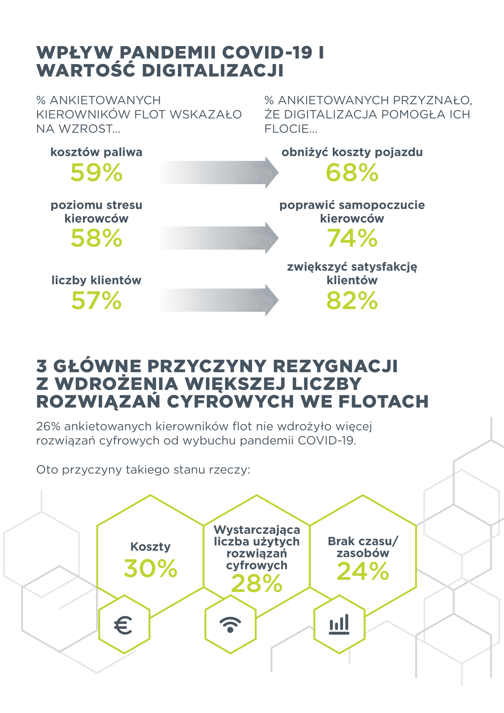 Badanie pokazuje, że digitalizacja pomaga w bezpośredni sposób zaradzić skutkom COVID-19. Wśród zaobserwowanych przez menedżerów flot zmian, rzutujących na funkcjonowanie ich firm w czasie pandemii, były m.in. wzrost kosztów paliwa (59 proc.), zwiększony poziom stresu u kierowców (58 proc.), ale także wzrost liczby klientów (57 proc.). Te zmiany korelują z benefitami, jakie zdaniem menedżerów przynosi cyfryzacja. Najważniejszą wymienianą przez nich korzyścią był wzrost satysfakcji klientów (82 proc.). Na drugim miejscu znalazła się poprawa samopoczucia kierowców (74 proc.), a na trzeciej pozycji – redukcja kosztów operacyjnych (68 proc.).