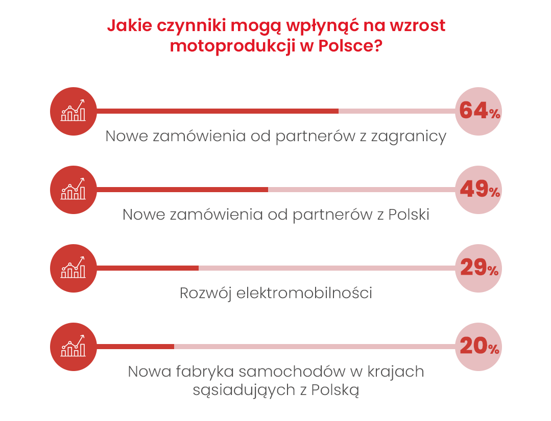 Nowe zamówienia od partnerów z zagranicy to najważniejszy czynnik wzrostu produkcji motoryzacyjnej wskazywany przez przedstawicieli 10 badanych krajów. Także w Polsce. W opinii 2 na 3 przedstawicieli polskich zakładów motoryzacyjnych wzrost produkcji będzie napędzany nowymi zamówieniami od partnerów zagranicznych, co nie dziwi, bo większość pojazdów i części do nich produkujemy na eksport. 49% wskazuje na zamówienia od krajowych partnerów. Na nabranie prędkości z e-autami liczy blisko co trzeci zapytany. Więcej e-optymistów jest tylko w Niemczech (56%).