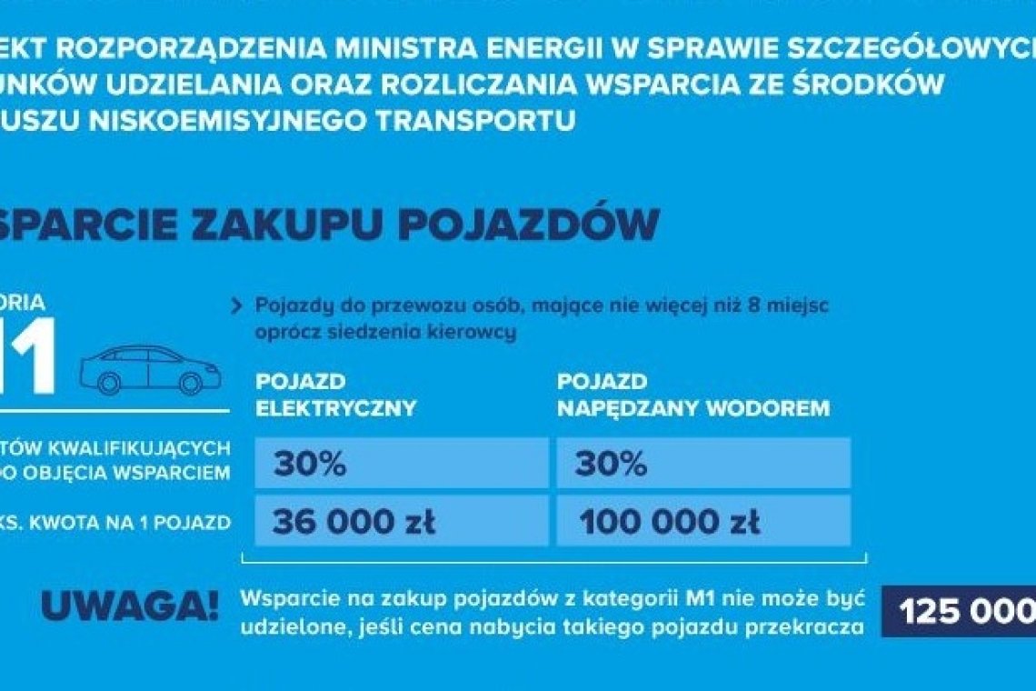 Na mocy aktualnej propozycji, maksymalna wysokość wsparcia w przypadku pojazdu elektrycznego kategorii M1 (pojazdy osobowe, posiadające nie więcej niż 8 miejsc oprócz siedzenia kierowcy), tak jak poprzednio, ma wynosić 30% kosztów kwalifikujących się do objęcia wsparciem, przy czym nie więcej niż 36 tys. zł na jeden pojazd. Pojazdy kategorii M1 zasilane gazem ziemnym mogą liczyć na nie więcej niż 20 tys. zł, zaś wodorem – nie więcej niż 100 tys. zł.