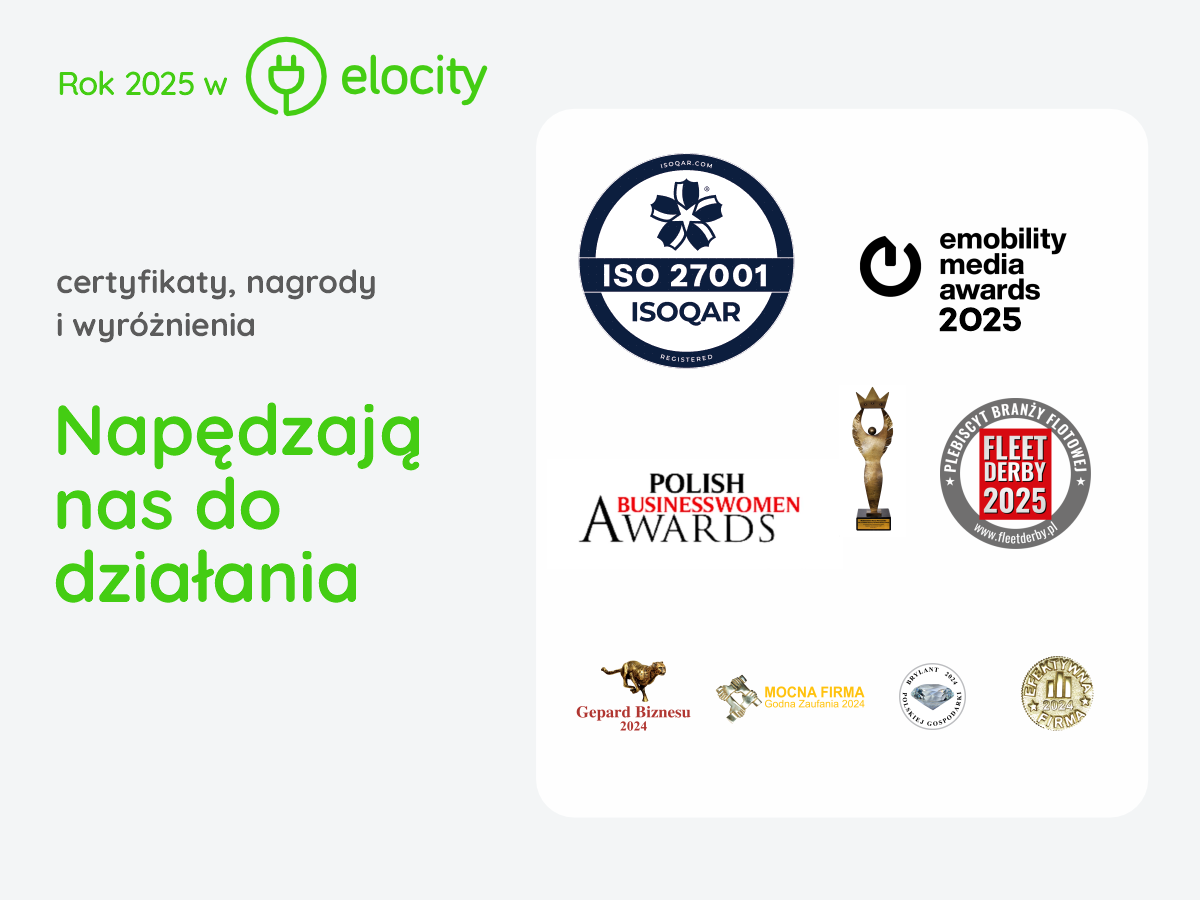 Miniony rok przyniósł Elocity również kolejne nagrody branżowe. Wśród najważniejszych była: e-Mobility Media Awards, przyznawana przez PSNM oraz Fundację EV Klub Polska za najbardziej intuicyjną aplikację do ładowania aut elektrycznych. Czytelnicy magazynu Fleet nagrodzili rozwiązania flotowe Elocity w plebiscycie Fleet Derby 2025.