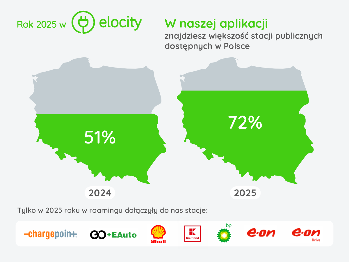 W efekcie użytkownicy aplikacji Elocity pod koniec 2025 roku mieli dostęp do łącznie 8 330 publicznych punktów ładowania. Dla porównania; według danych Licznika Elektromobilności, prowadzonego przez Polskie Stowarzyszenie Nowej Mobilności oraz Polski Związek Przemysłu Motoryzacyjnego, pod koniec listopada 2025 roku w Polsce funkcjonowało 11 549 ogólnodostępnych punktów ładowania. Oznacza to, że z poziomu aplikacji Elocity kierowcy mogli korzystać z aż 72% publicznej infrastruktury ładowania w Polsce (rok wcześniej było to 55%).