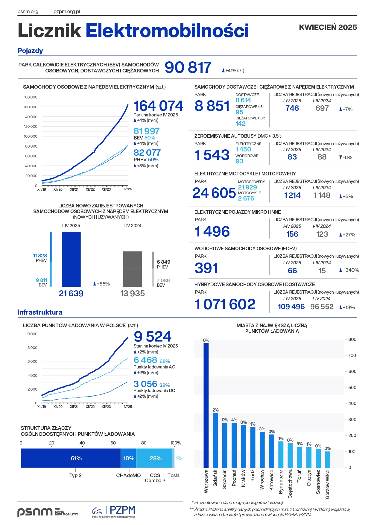 Równolegle do floty pojazdów z napędem elektrycznym rozwija się infrastruktura ładowania. Pod koniec kwietnia 2025 r. w Polsce funkcjonowały 9 524 ogólnodostępne punkty ładowania pojazdów elektrycznych. 32% z nich stanowiły szybkie punkty ładowania prądem stałym (DC), a 68% – wolne punkty prądu przemiennego (AC) o mocy mniejszej lub równej 22 kW.