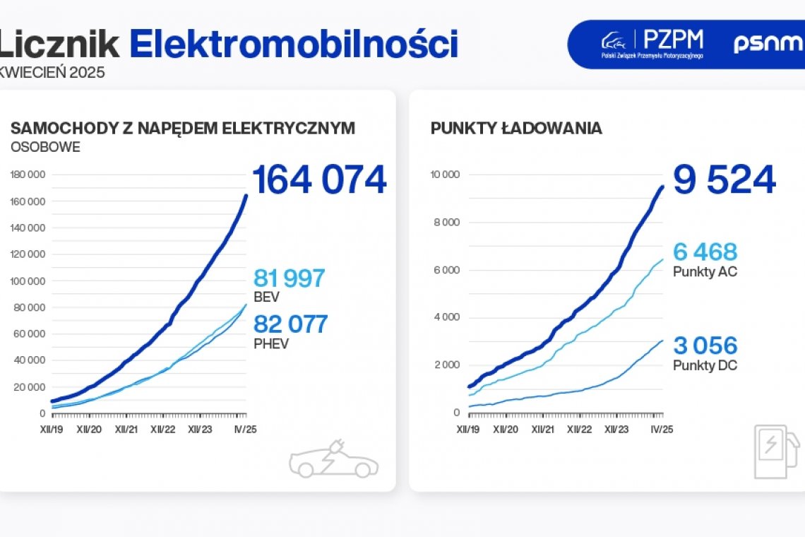 Pod koniec kwietnia 2025 r. po polskich drogach jeździły 164 074 samochody osobowe z napędem elektrycznym. Flota w pełni elektrycznych, osobowych aut (BEV, ang. battery electric vehicles) liczyła 81 997 szt., a park hybryd typu plug-in (PHEV, ang. plug-in hybrid electric vehicles) – 82 077 szt.