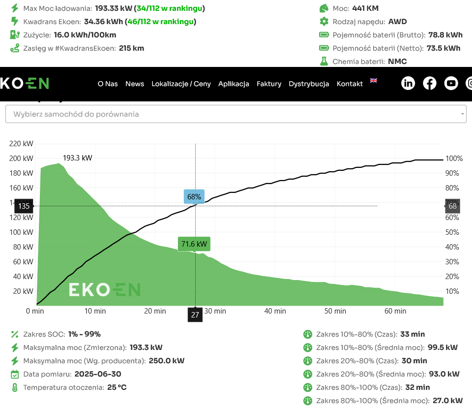 Ekoen mierzy bowiem, niemal każdy parametr ładowania, co ciekawe podczas testu od niemal zera do 100 proc. (zakres SOC). Po wybraniu samochodu otwiera się karta, na której oprócz wykresu z krzywą ładowania widać poszczególne kategorie.