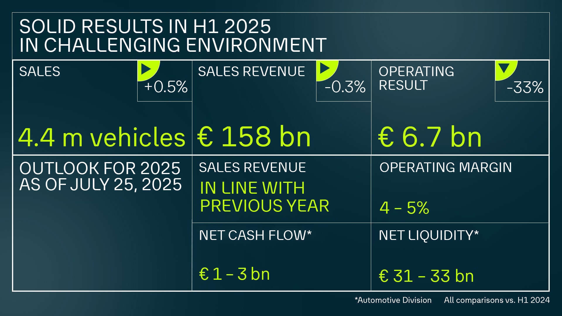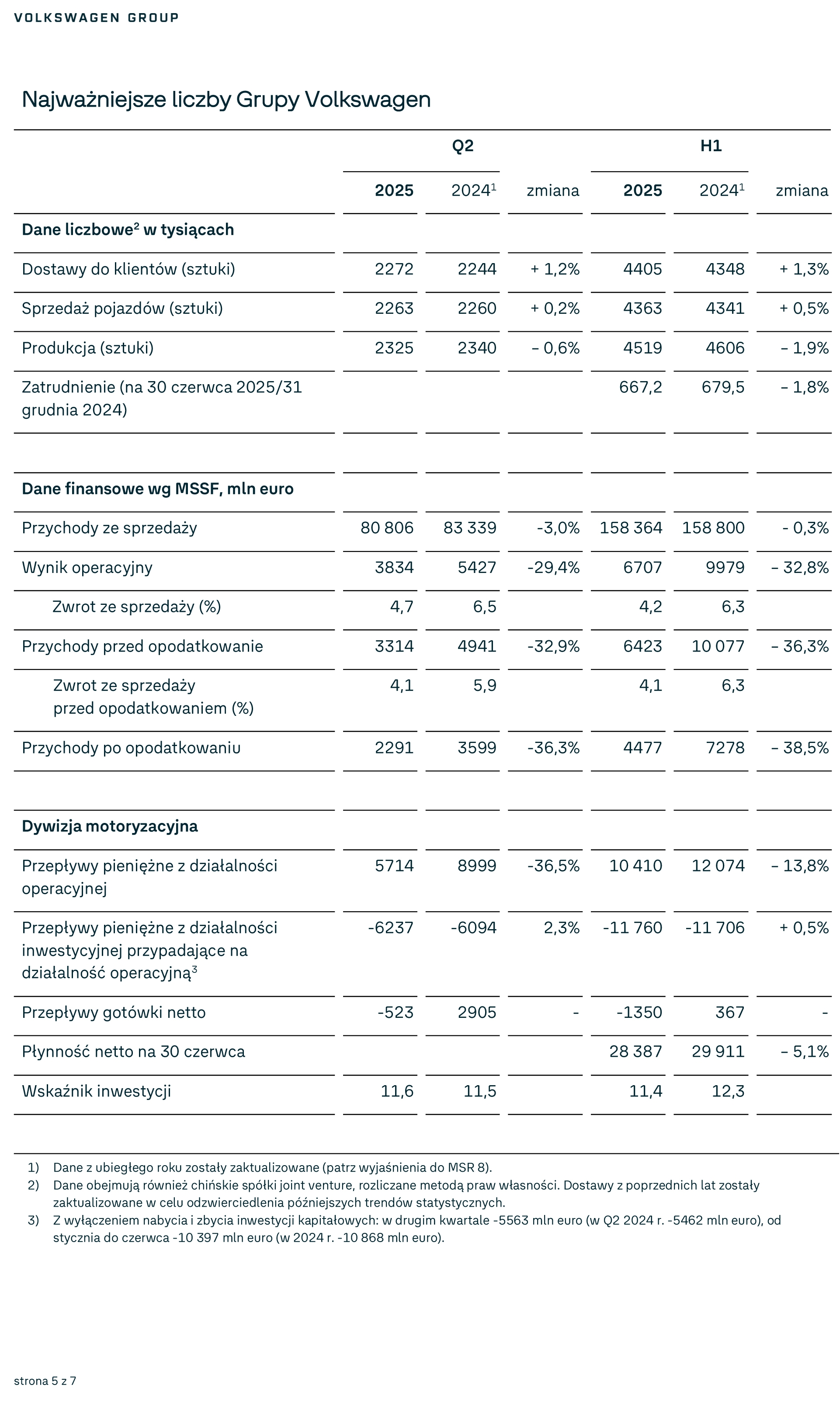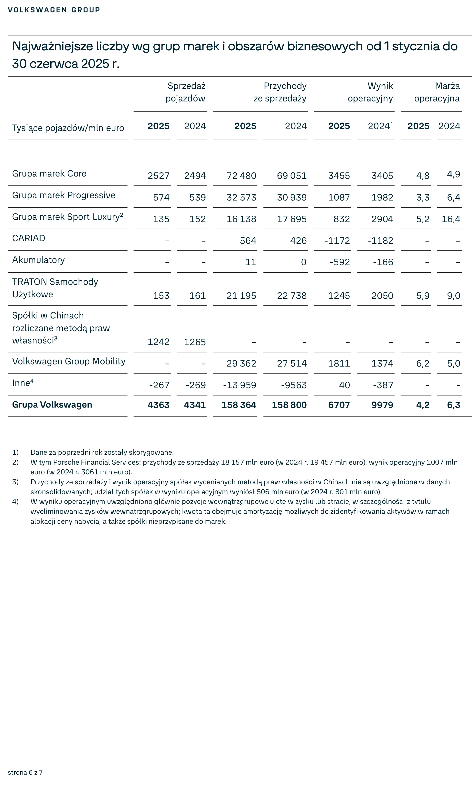 Wynik operacyjny na poziomie 6,7 mld euro w pierwszej połowie 2025 r., o 33% mniej niż rok wcześniej (10 mld euro); marża operacyjna wyniosła 4,2% - Spadek wynikał przede wszystkim z kosztów związanych ze wzrostem ceł w USA (1,3 mld euro), restrukturyzacją w markach Audi, Volkswagen i Cariad (0,7 mld euro) oraz kosztów związanych z emisją CO₂. Wpływ miał także wyższy udział aut elektrycznych, a także efekty cenowe i walutowe. Przed zmianą ceł w USA i restrukturyzacją marża operacyjna wynosiła 5,6%.